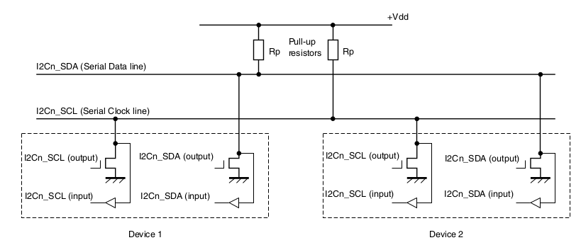 I2C只用来两根线:SCL(Serial Clock Line 串行时钟线)和SDA(Serial Data Line串行数据线),两台设备间通过这两条线连接的时候需要通过上拉电阻和Vdd连接