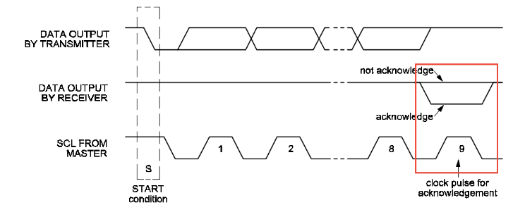 数据接收方收到传输的一个字节数据后,需要给出响应,此时处在第九个时钟,发送端释放SDA线控制权,将SDA电平拉高,由接收方控制。若希望继续,则给出“应答(ACK)”信号,即SDA为低电平;反之给出“非应答(NACK)”信号,即SDA为高电平。