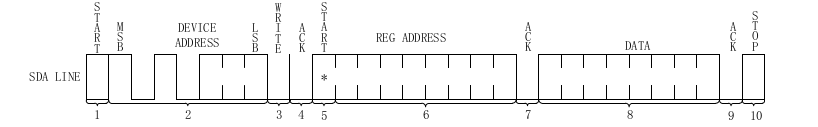 I2C的数据传输一般是由主机发起的,主机(master)发出时钟信号和Start信号,然后每发送8个bit都会跟一个对应从机的ACK信号,下面的图对应的就是写数据的流程(图表上MSB为高地址,LSB为低地址)