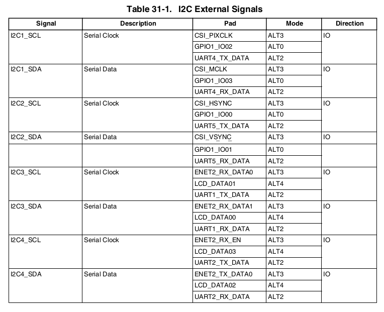 前面说过,I.MX6UL提供了4个I2C接口。对应的物理引脚如下