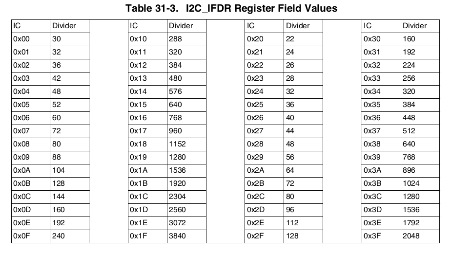 可以看出来,I2C的时钟可以从66MHz的PERCLK_CLK_ROOT=IPG_CLK_ROOT,也可以从下面的表里看出来可以选用perclk_clk_rook