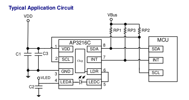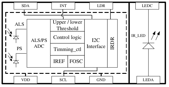 这次的I2C通讯实操我们是用了个AP3216C的IC作为从机和I.MX6UL进行数据交互。IC具有光强度(ALS)、接近距离(PS)和红外线强度(IR)三个参数检测功能。3216的内部框图和外围的电路放在下面