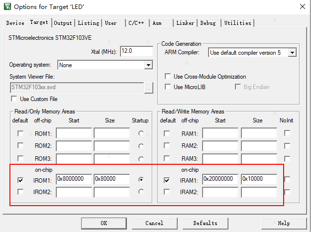 当选好型号后,Target页面的ROM和RAM设置就已经按默认的自动配置好了。