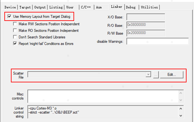 默认情况下,Linker页面的Usw Menory Layout from Target Dialog是勾选上的,意思是以前面Target页面的内存布局为准。可以看到下图中的Scatter File是没有文件的,因为这时候内存布局是依靠前面Target页面设置为准,这里有没有这个分散加载文件无所谓。