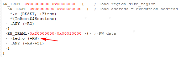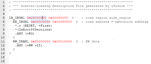 MDK 生成一个以工程名命名的后缀为 *.sct 的分散加载文件 (Linker Control File,scatter loading),链接器根据该文件的配置分配各个节区地址,生成分散加载代码,因此我们通过修改该文件可以定制具体节区的存储位置。
