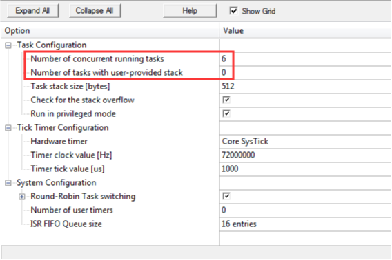 表示允许用户创建 6 个任务,所有的 6 个任务都是分配第三个参数 Task statck size 大小的任务堆栈空间。