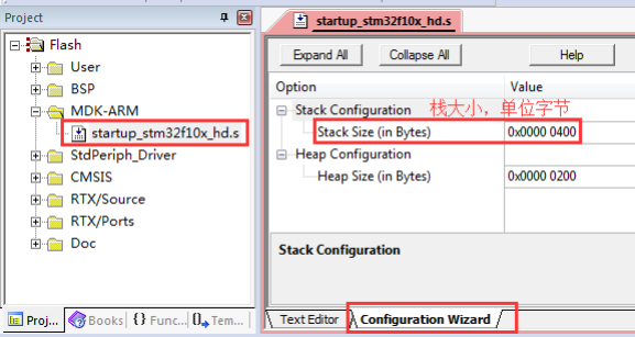 不管是裸机编程还是 RTOS 编程,栈的分配大小都非常重要。局部变量,函数调时现场保护和返回地址,函数的形参,进入中断函数前和中断嵌套等都需要栈空间,栈空间定义小了会造成系统崩溃。 裸机的情况下,用户可以在这里配置栈大小: