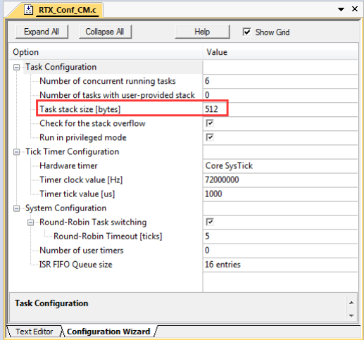 不同于裸机编程,在 RTOS 下,每个任务都有自己的栈空间。任务的栈大小可以在配置向导中通过如下参数进行配置: