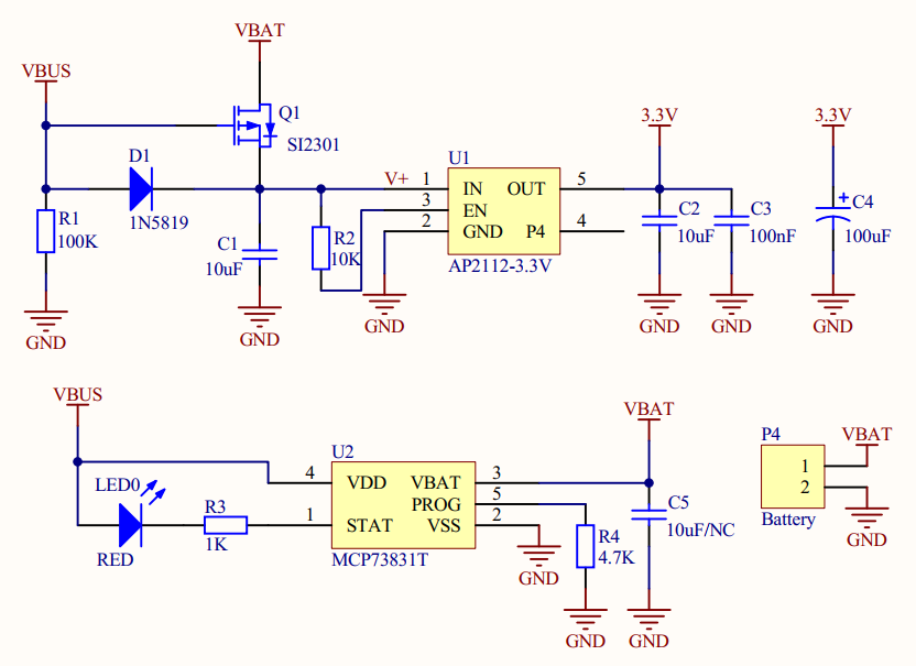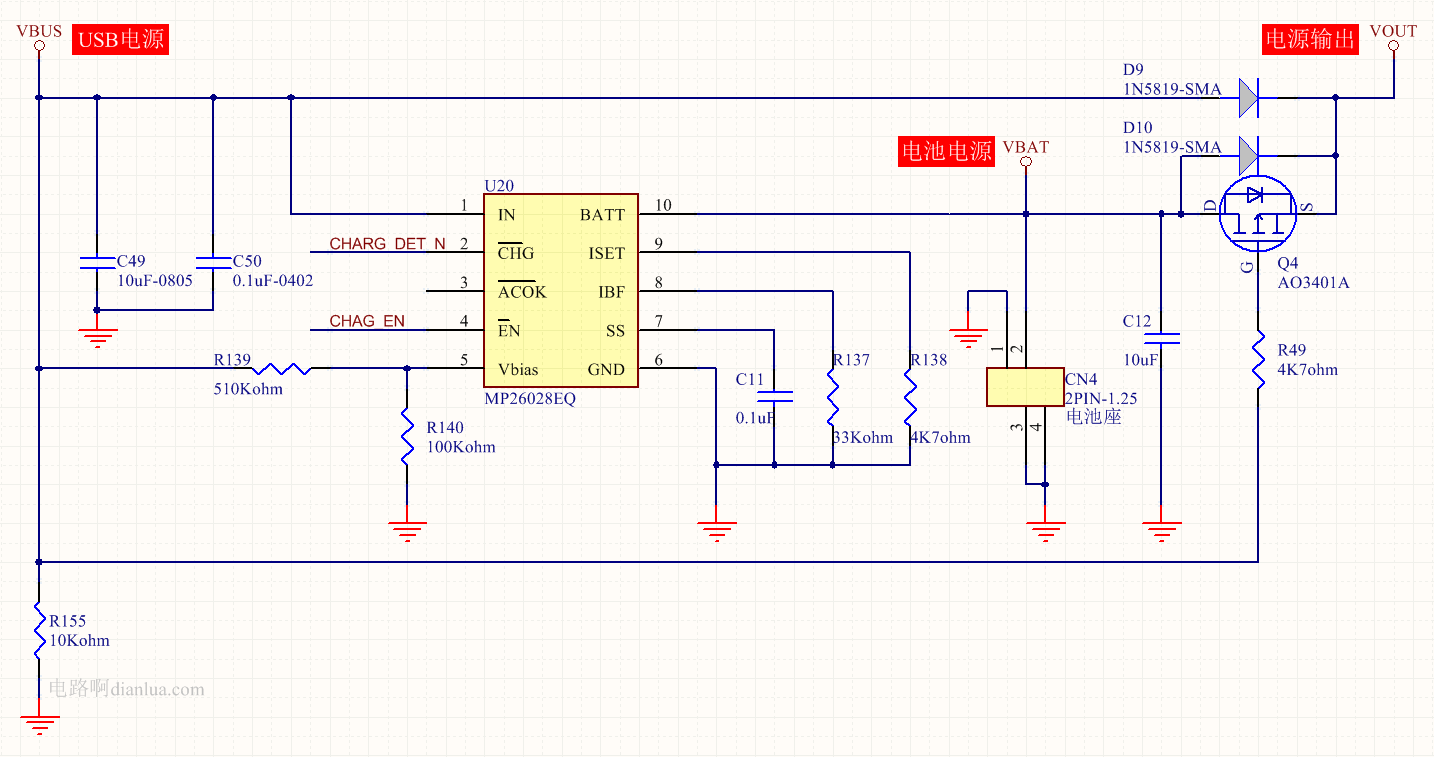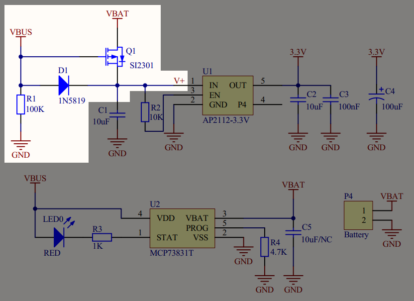 2、当拔掉USB电源时,切换为由内置的锂电池供电,即VBAT对VOUT供电。