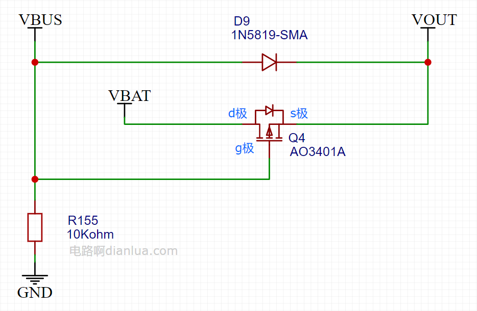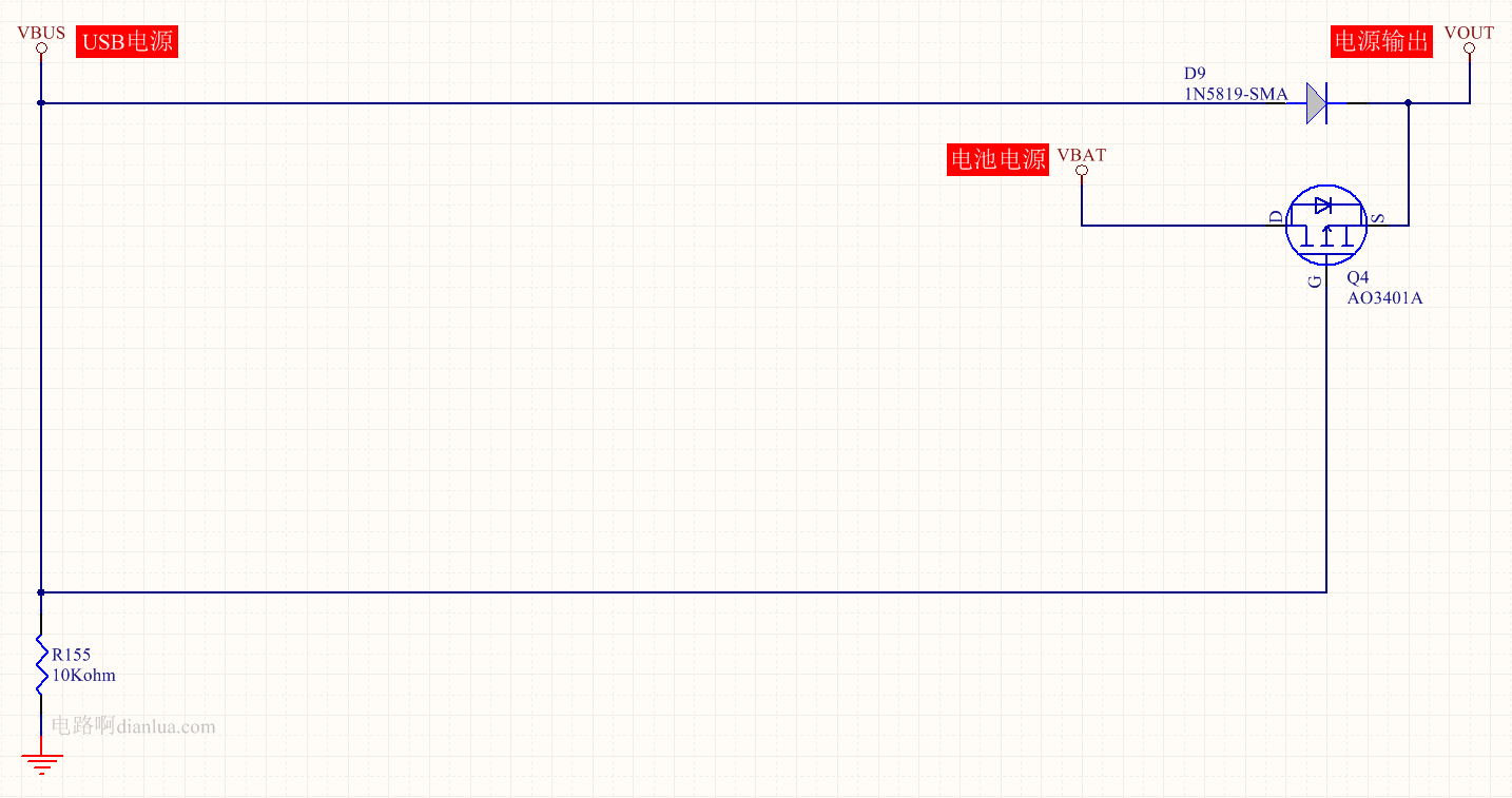 这一下子,电路变得好简单,实现电源切换的功能,竟然只需要一个二极管、一个MOS管、一个电阻!