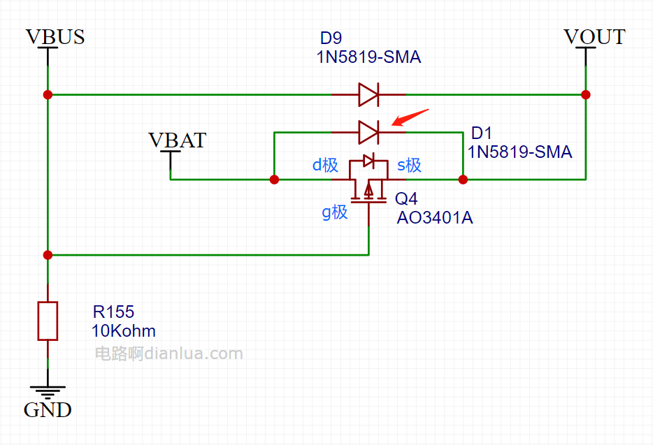 该肖特基二极管D1的正向导通压降约为0.3V,比MOS管的体二极管要小。在MOS管完全打开之前,VBAT通过肖特基二极管D1对VOUT进行供电,可以缓解VOUT电压下降过多的问题。