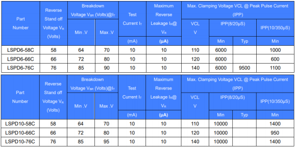 ① 器件选型:防护等级不高,则选择 SMDJ58CA 或者 5.0SMDJ58CA,如果防护等级比较高,市面上使用比较多的是力特的 AK10 系列,插件产品,而我司新进研发的 LSPD6 系列和 LSPD10 系列完美替代 AK10 系列,且为贴片封装,十分有利于自动化生产,其参数如下所示:
