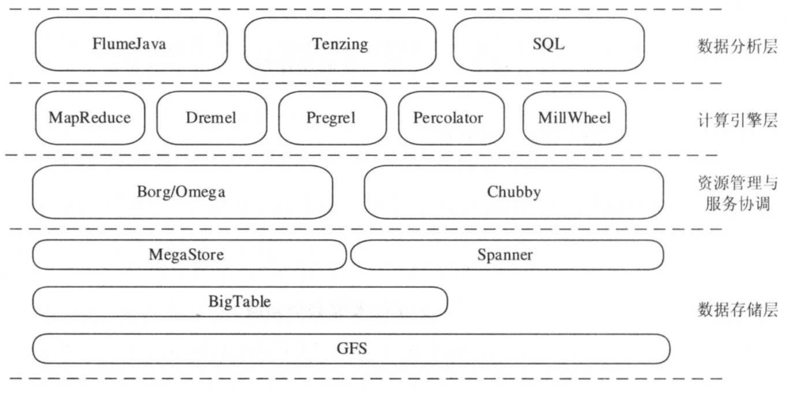 Google公司在大数据方面的技术,均是以发表论文的形式对外公开的,尽管没有对外开源系统实现代码,但这些论文直接带动了大数据技术的发展,尤其为大数据开源技术的发展指明了方向。Google公开发表的大数据系统方面的论文目前绝大都存在对应的开源系统实现。总结近10年Google发表的论文,设计的大数据系统如下图所示:主要分布在数据存储层,资源管理层于服务协调层,计算引擎层,数据分析层这四层中。