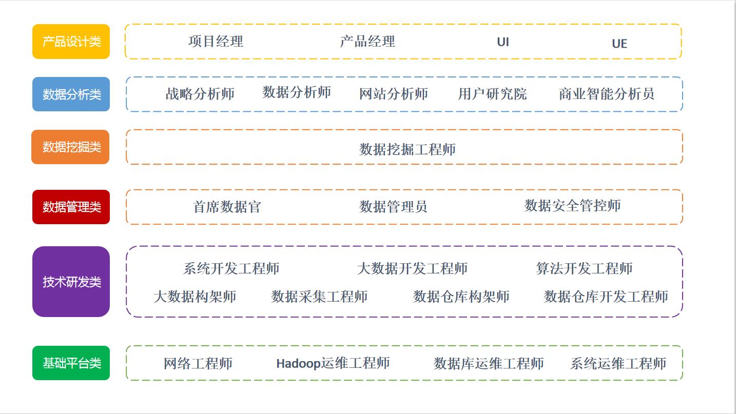 数据管理类岗位中的管理针对的对象是数据,而非职能岗位中的管理角色。数据管理类岗位包括首席数据官,数据管理员和数据安全工程师。 一.首席数据官 随着大数据的不断发展,企业对于数据的依赖也越来越强,当企业内部的数据类型和数据用途越来越多时,需要一个“数据管理者”从数据全场景和流程方面进行整体规划和管理,一个大数据新的工作岗位应运而生,即首席数据官(CDO)。 该职位的职责包括:与数据所有者和数据管理员共同为内部和外部创建数据管理策略并且实现数据的准确性和制定工作流程的需求目标,定义大数据战略,设计多阶实施路线图。建立数据管理策略及标准,创建并领导数据管理团队,监管组织类的数据质量工作,配合CIO/CTO和IT部门协调管理和完善数据管理策略的实施,并负责企业信息数据管理的预算和数据相关系统的审核。 二.数据管理员 对于一般公司来说,数据管理员的工作可能由数据库运维工程师来兼任,从部署操作系统,到数据库安装,设计和部署监控,放置漏洞和攻击,主数据管理,权限管理与审核等,而大数据环境下对数据管理员工作的技能要求更加精细。 三.数据安全管控师 数据安全是互联网行业中一个永恒的话题,无论是对于单位还是个人,数据安全是至关重要的,如果数据不慎丢失或者泄漏,都会造成重大影响。