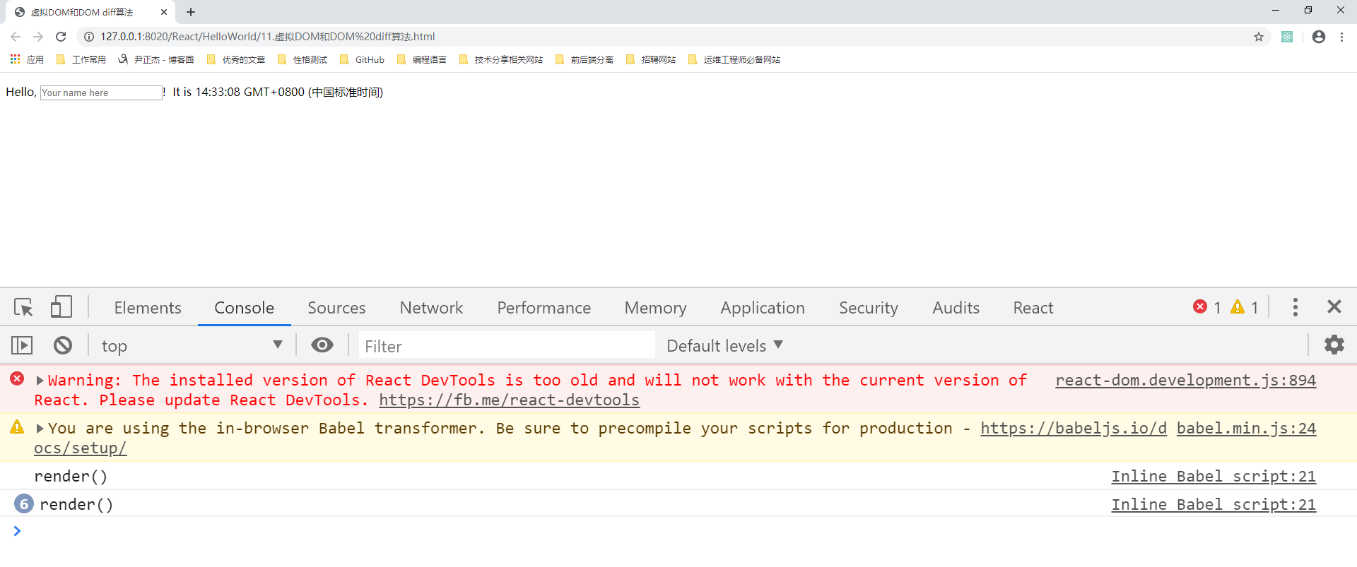 <!DOCTYPE html> <html> <head> <meta charset="UTF-8"> <title>虚拟DOM和DOM diff算法</title> </head> <body> <div id="box1"></div> </body> <!--导入 React的核心库--> <script type="text/javascript" src="../js/react.development.js"></script> <!--导入提供操作DOM的react扩展库--> <script type="text/javascript" src="../js/react-dom.development.js"></script> <!--导入解析JSX语法代码转为纯JS语法代码的库--> <script type="text/javascript" src="../js/babel.min.js"></script> <!--导入解析解析props属性的库--> <script type="text/javascript" src="../js/prop-types.js"></script> <script type="text/babel"> //1>.定义组件 class HelloWorld extends React.Component { constructor(props) { super(props) this.state = { date: new Date() } } componentDidMount () { setInterval(() => { this.setState({ date: new Date() }) }, 1000) } render () { console.log('render()') return ( <p> Hello, <input type="text" placeholder="Your name here"/>! It is {this.state.date.toTimeString()} </p> ) } } //2>.渲染组件 ReactDOM.render(<HelloWorld/>,document.getElementById('box1')) </script> </html>
