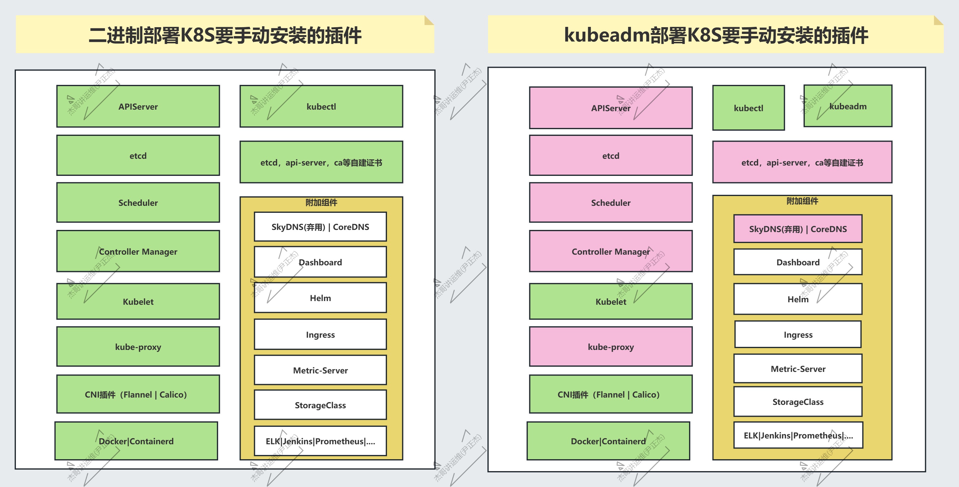 - 官方默认都有两种部署方式: (在生产环境中都可以使用,且都支持高可用环境。咱们学习过程中,建议选择kubeadm。)