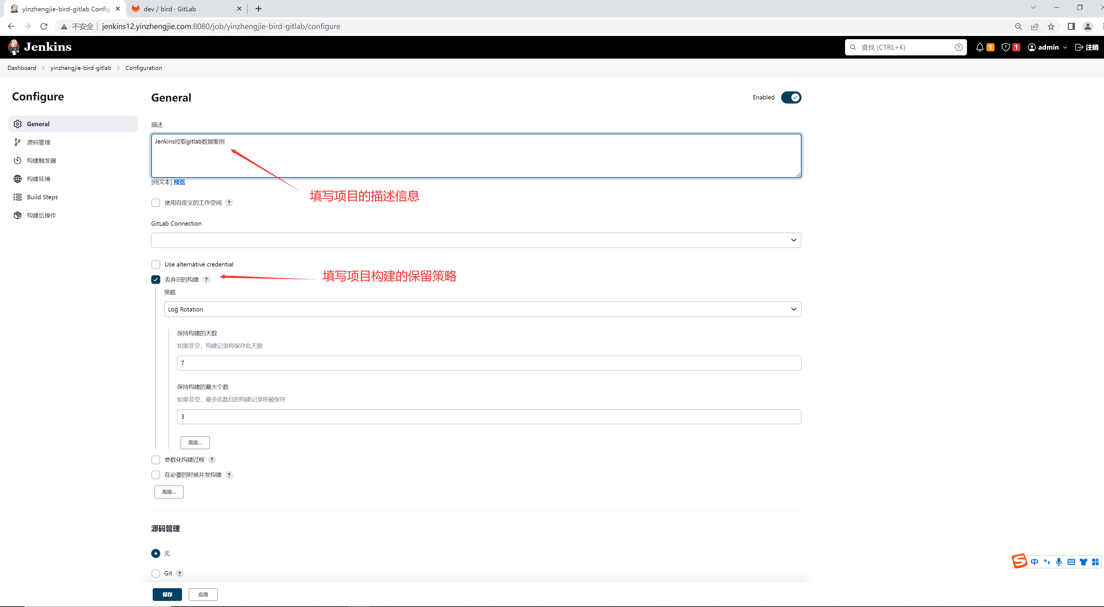 如上图所示,填写项目的描述信息后,配置构建的保留策略即可。