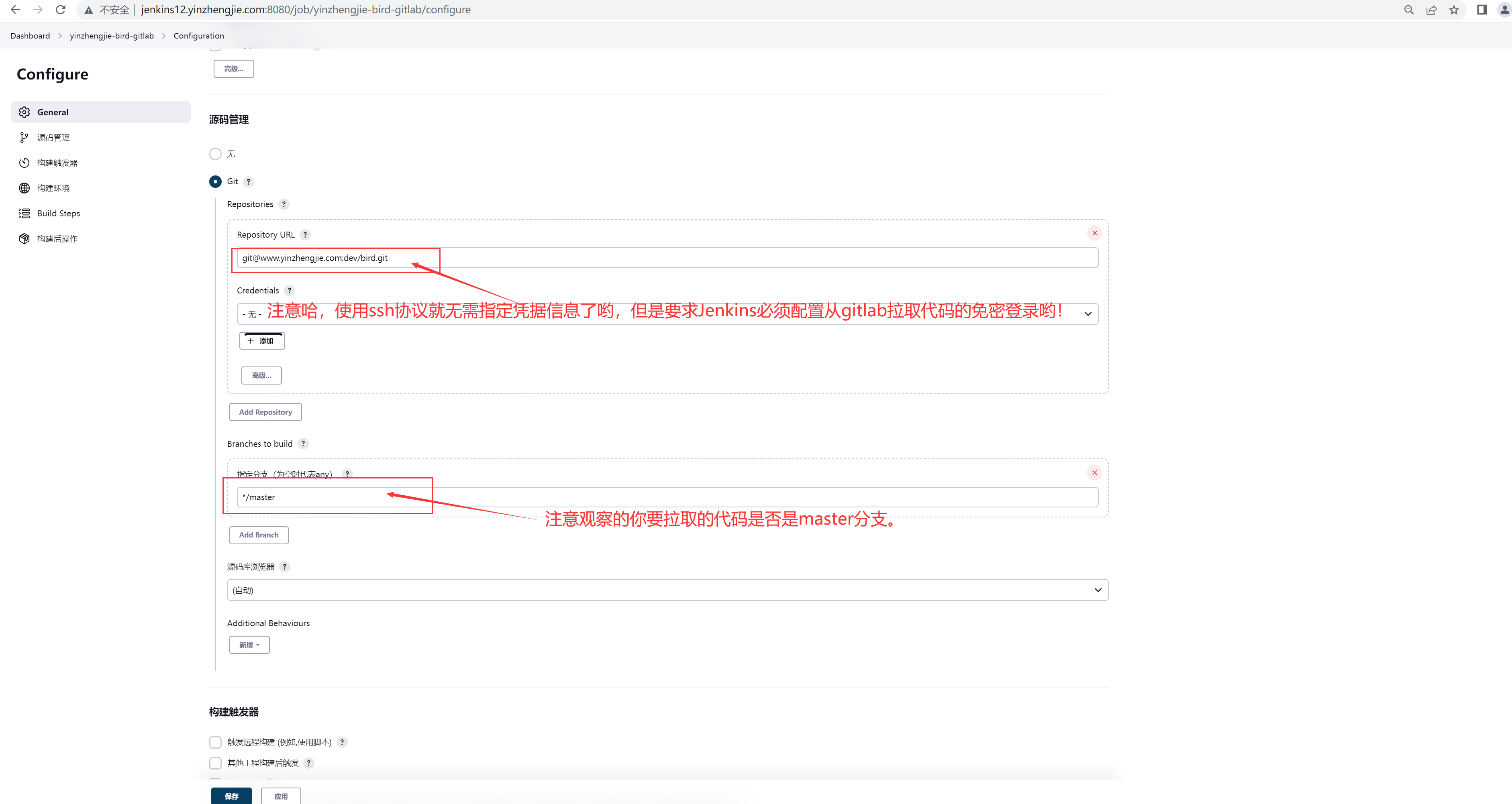 如上图所示,配置源码管理,此处我使用了ssh协议,如果使用http协议,请指定凭据哟!