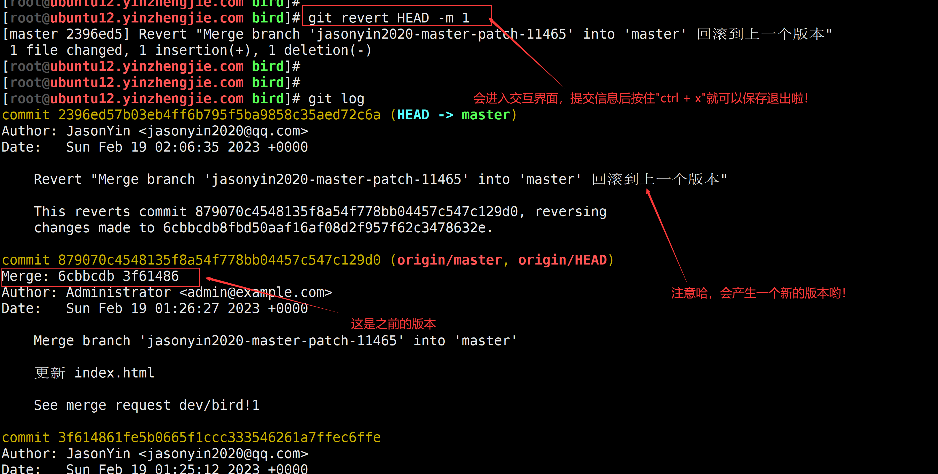 使用"git revert HEAD -m 1"可以进入到交互式界面,输入提交信息后,按住"ctrl + x"就可以保存退出。