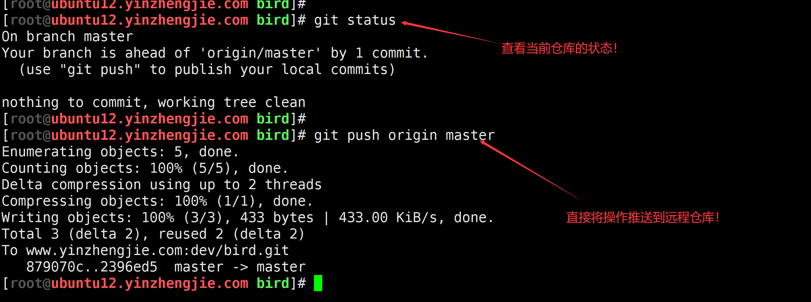 如上图所示,使用"git push origin master"命令将操作推送到远程仓库。
