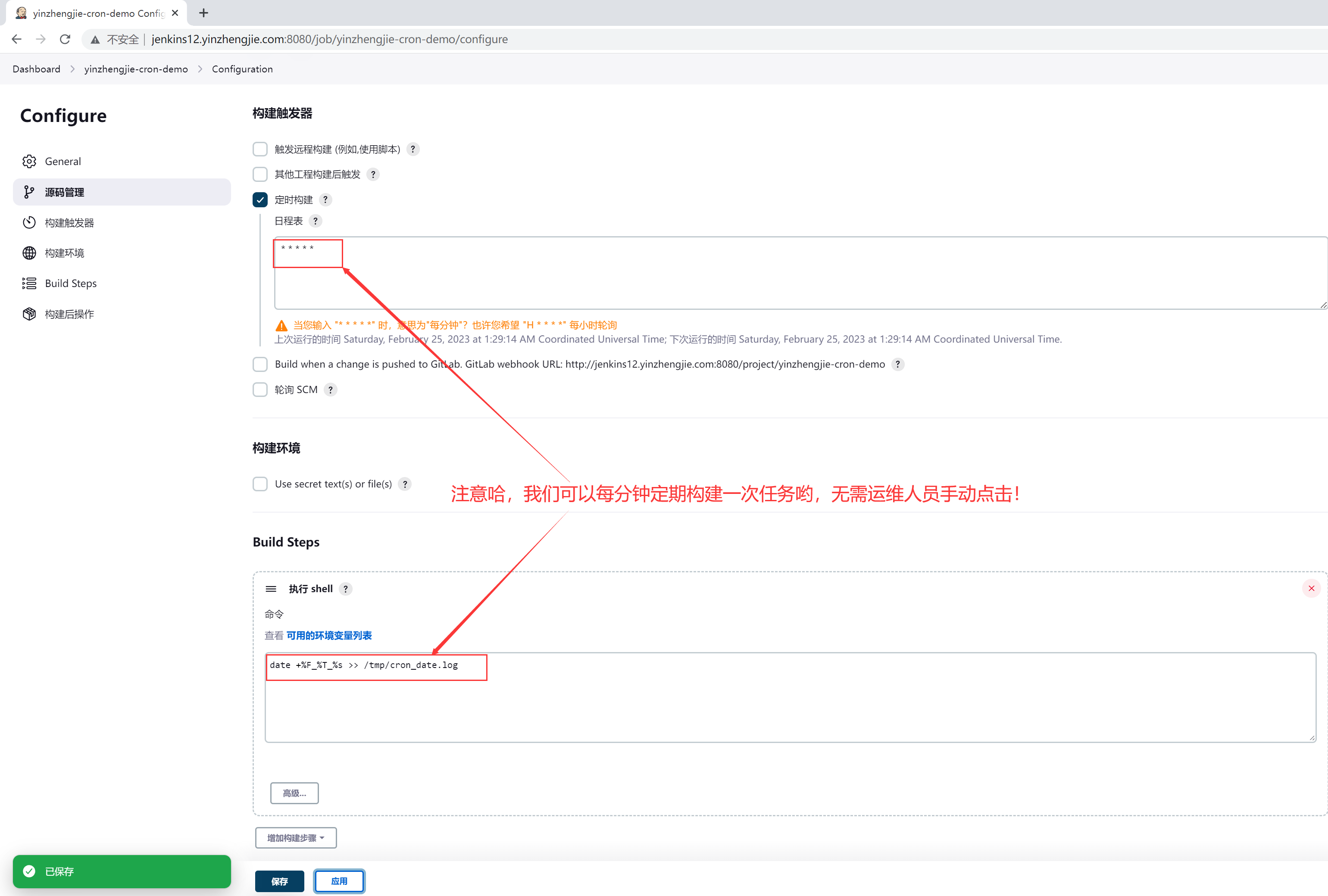 2.2 配置每分钟定时构建一次任务(不使用H)