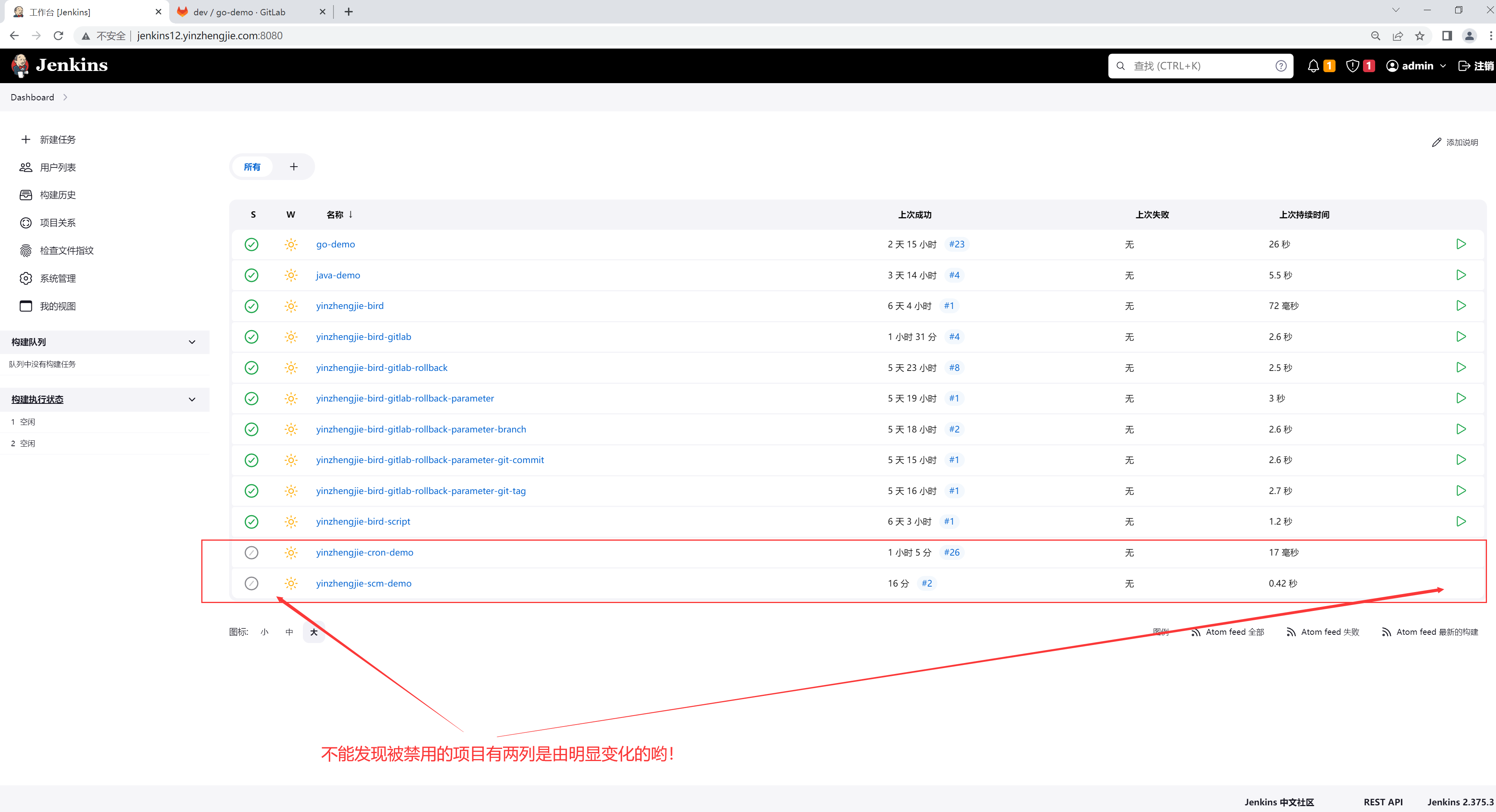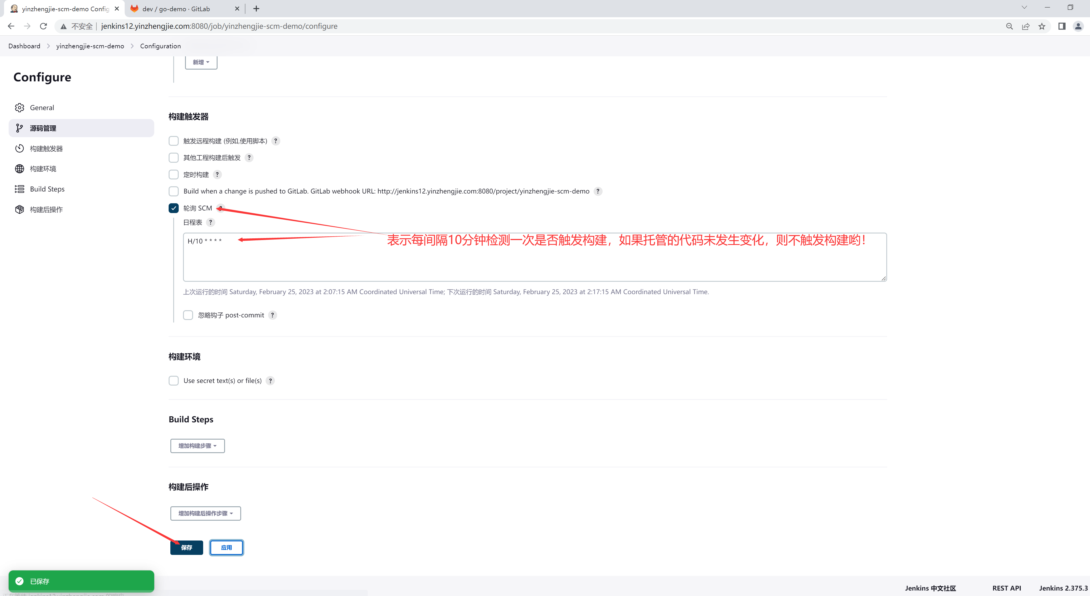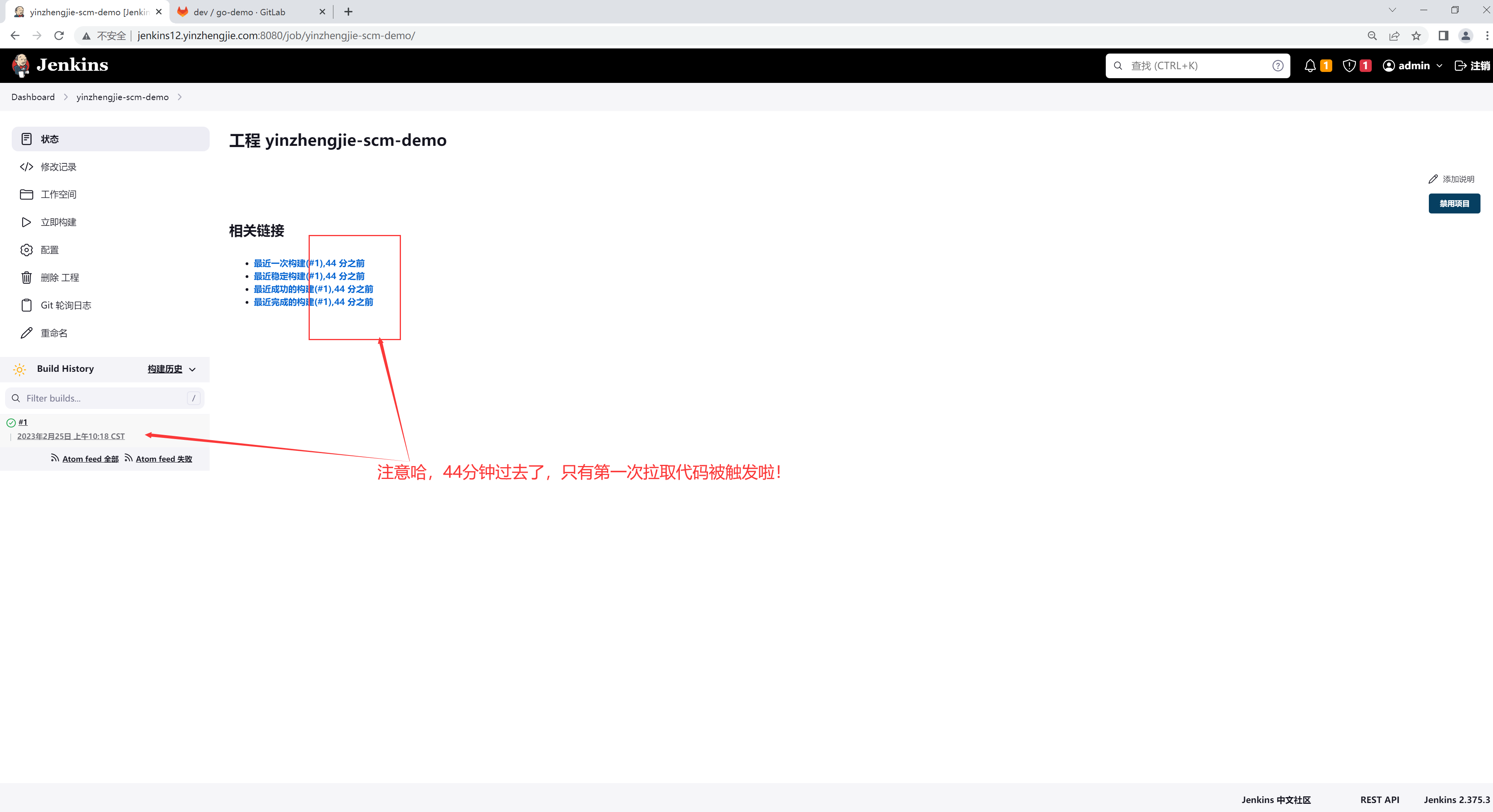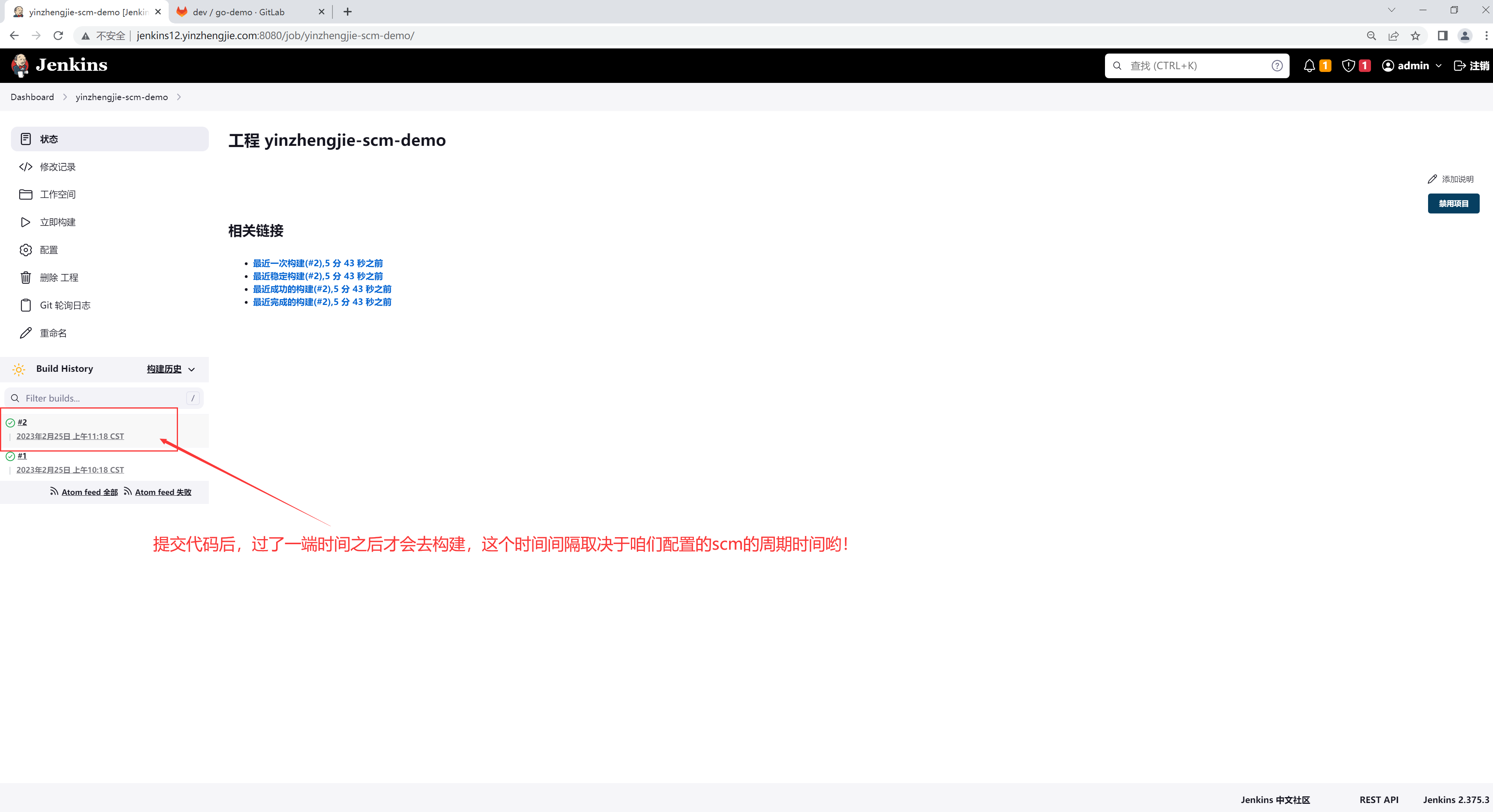 经过案例演示,不难发现使用scm构建并不会立刻去拉取代码编译,而是要根据周期性任务间隔时间去坚持gitlab代码是否发生变化后再判断是否构建。