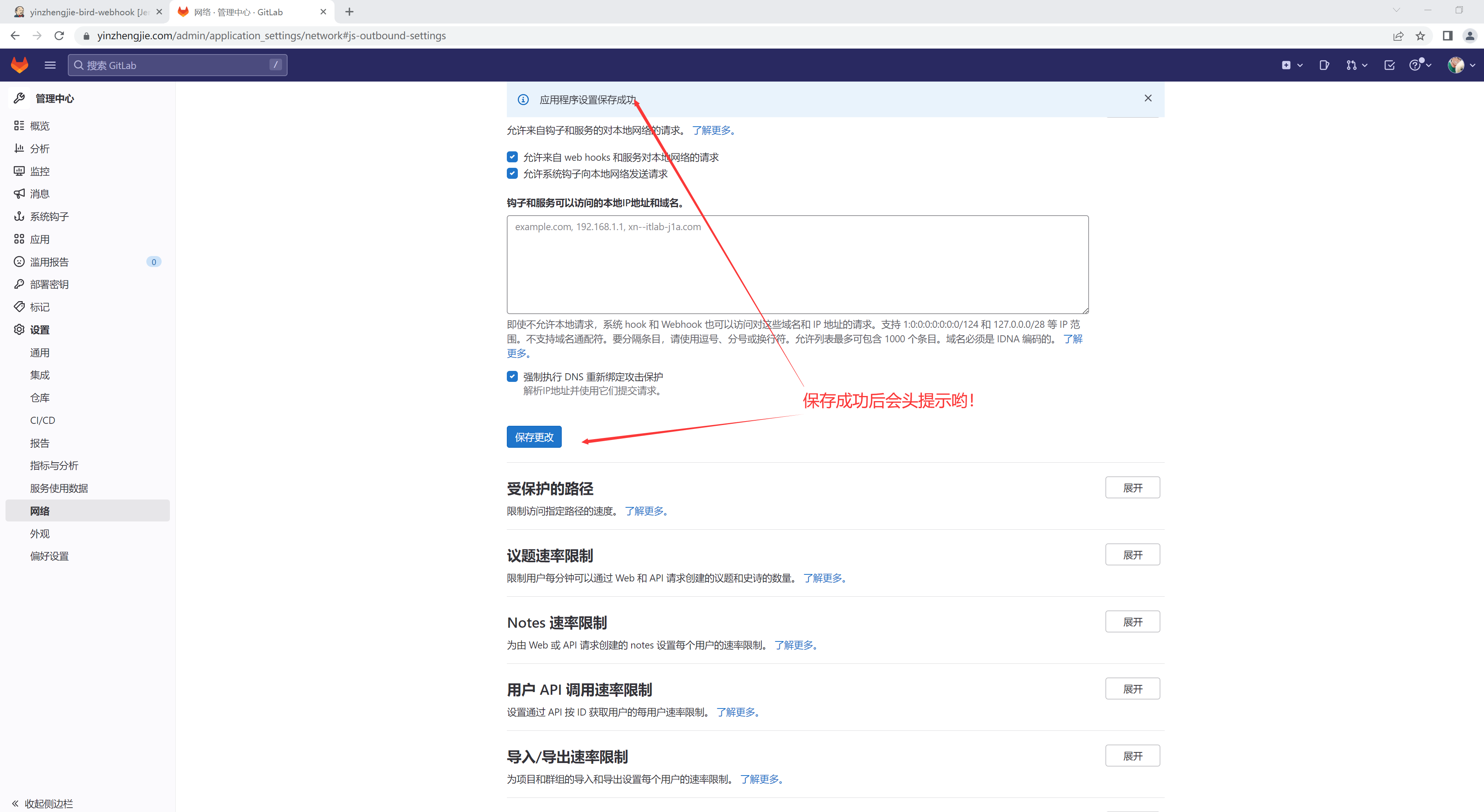 (2)添加webhook时必须让gitlab配置允许来自"web hooks"和服务对本地网络的请求;