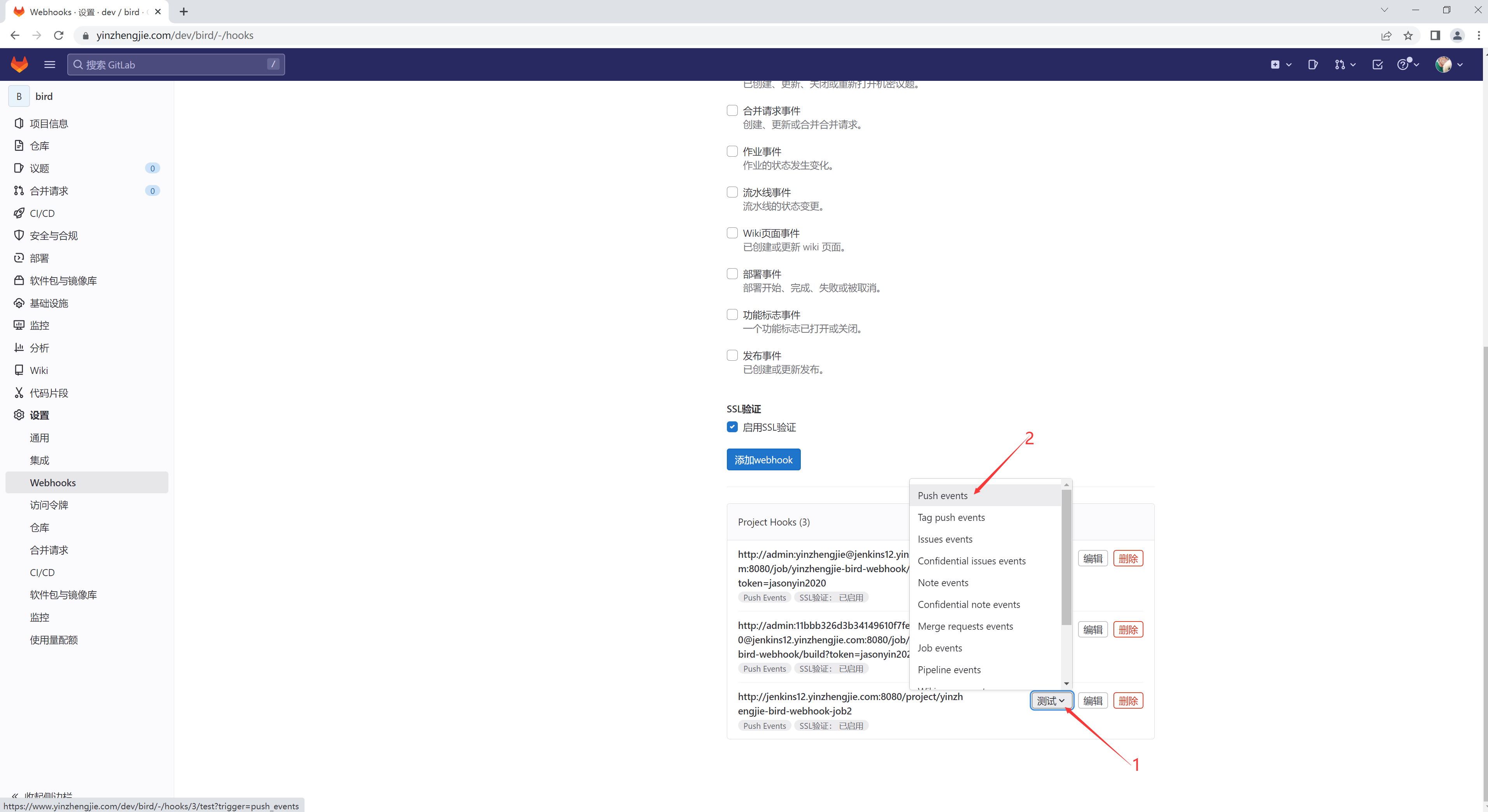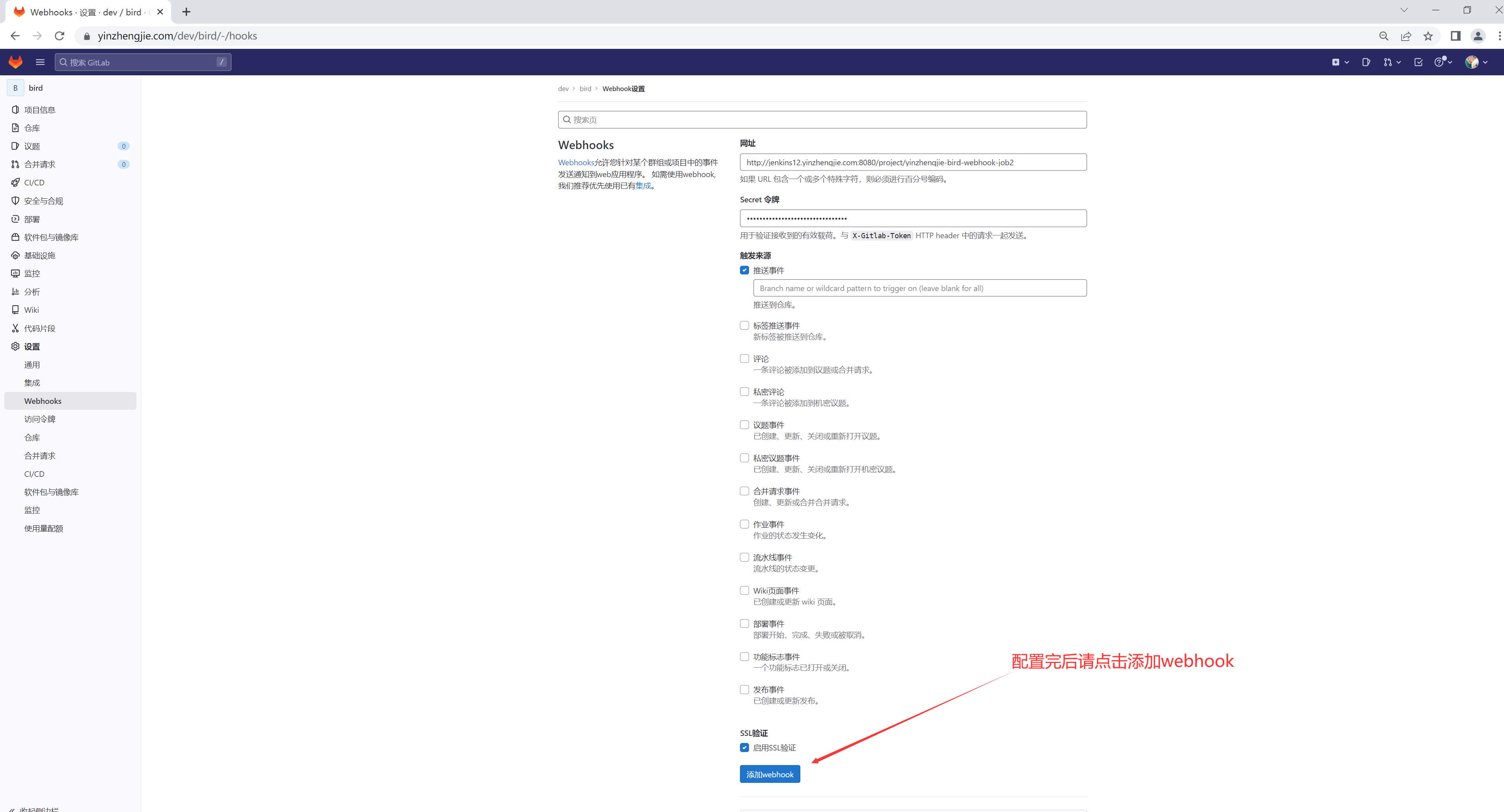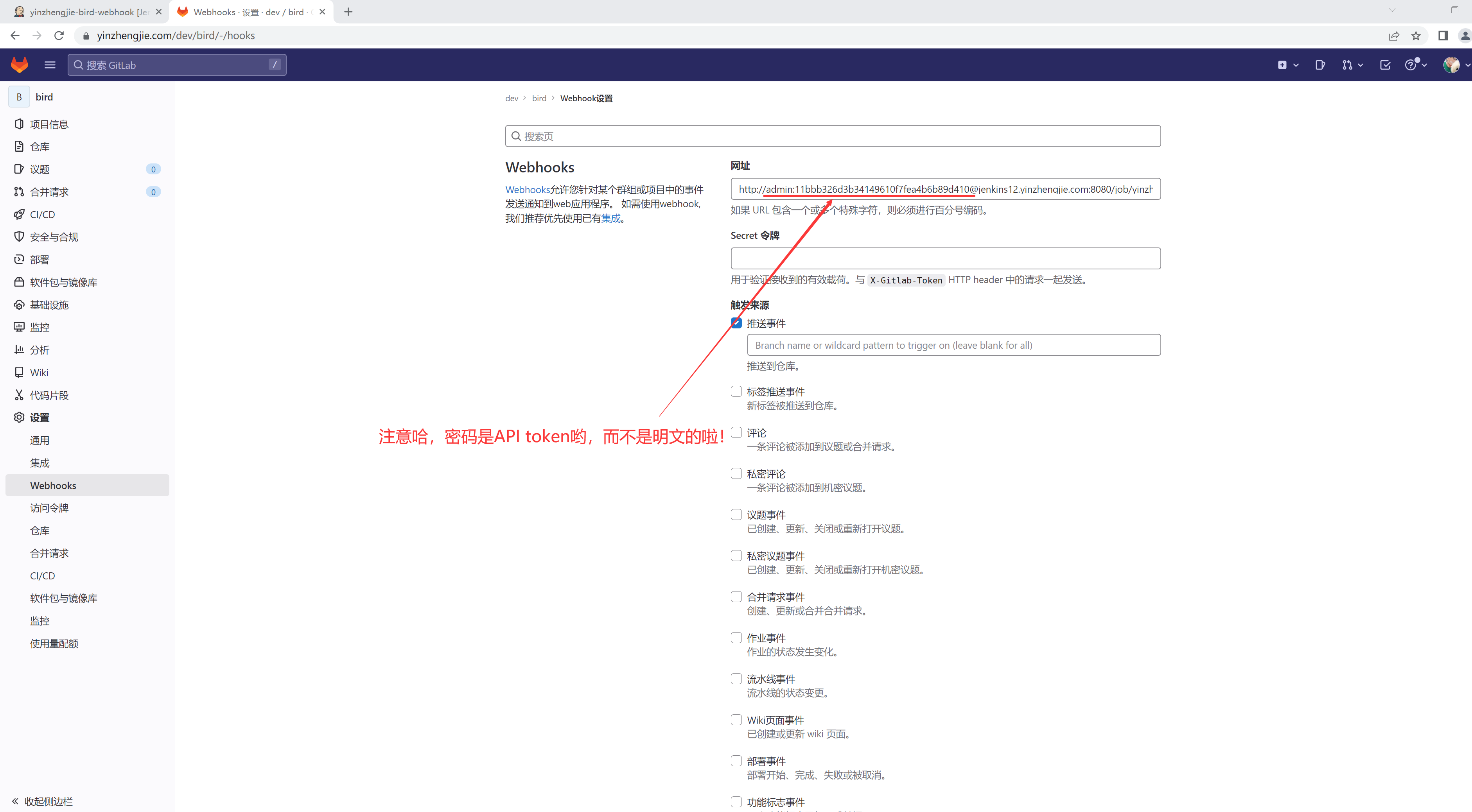 如上图所示,我们可以将Jenkins提供的配置直接复制到gitlab的webhook即可。