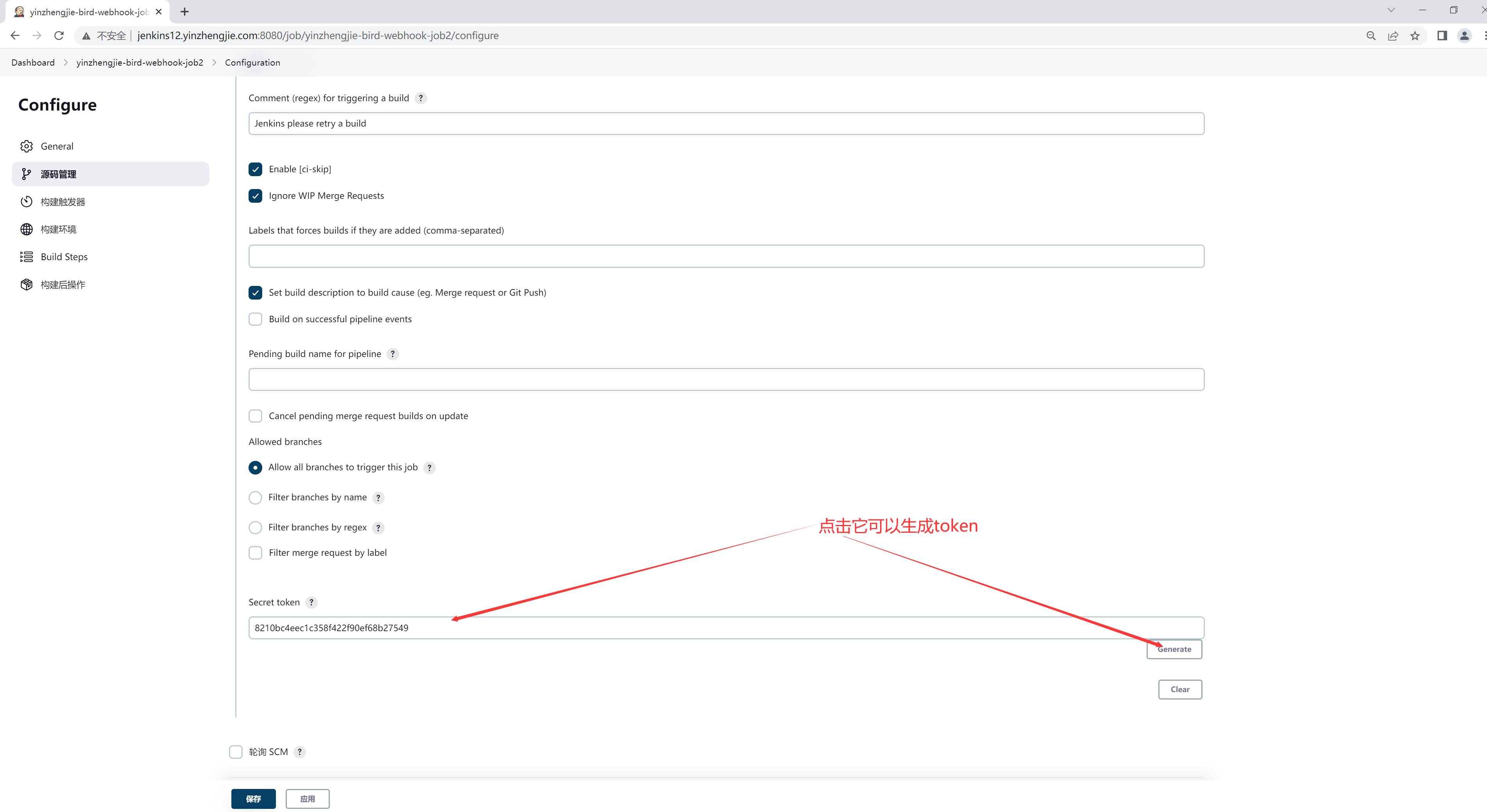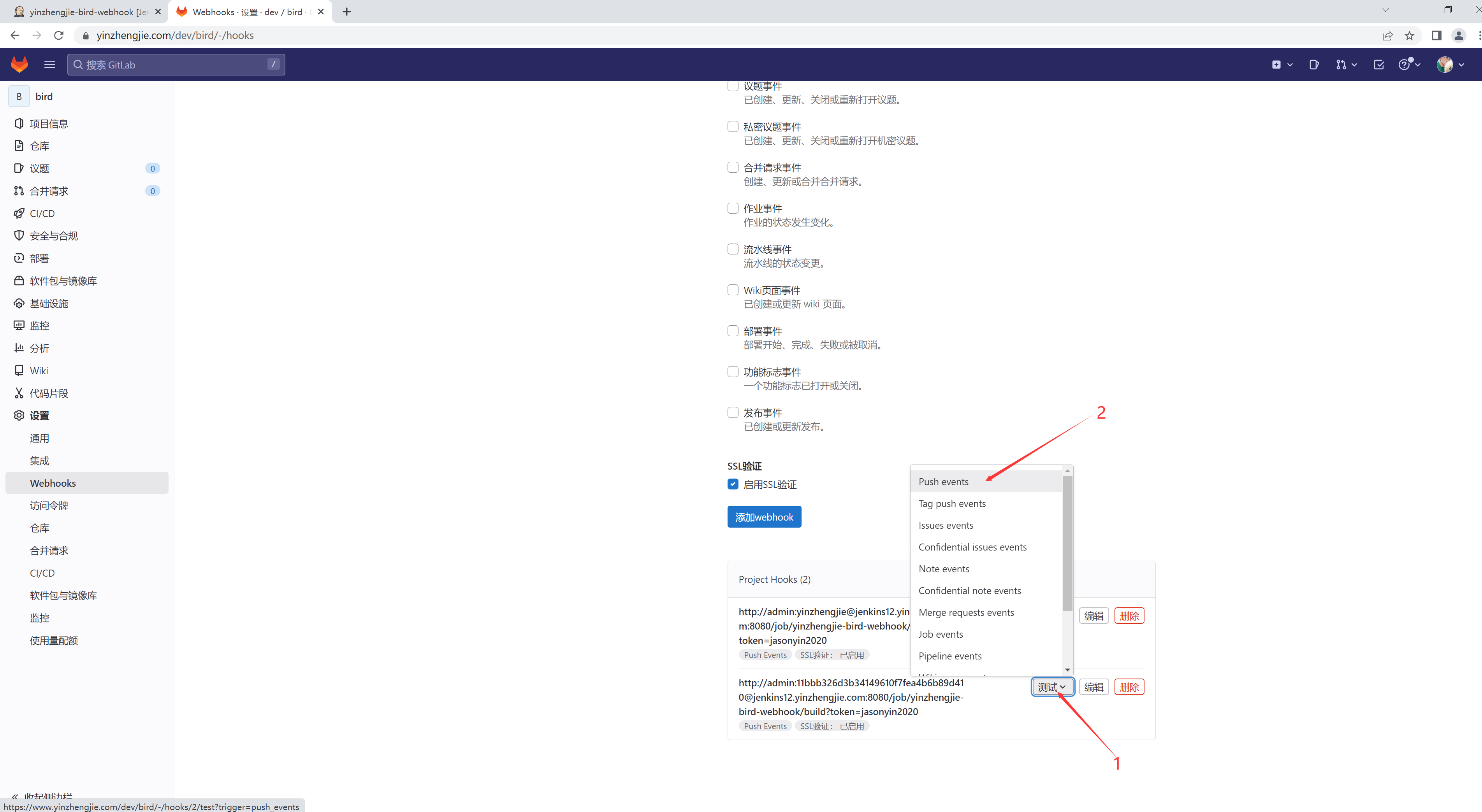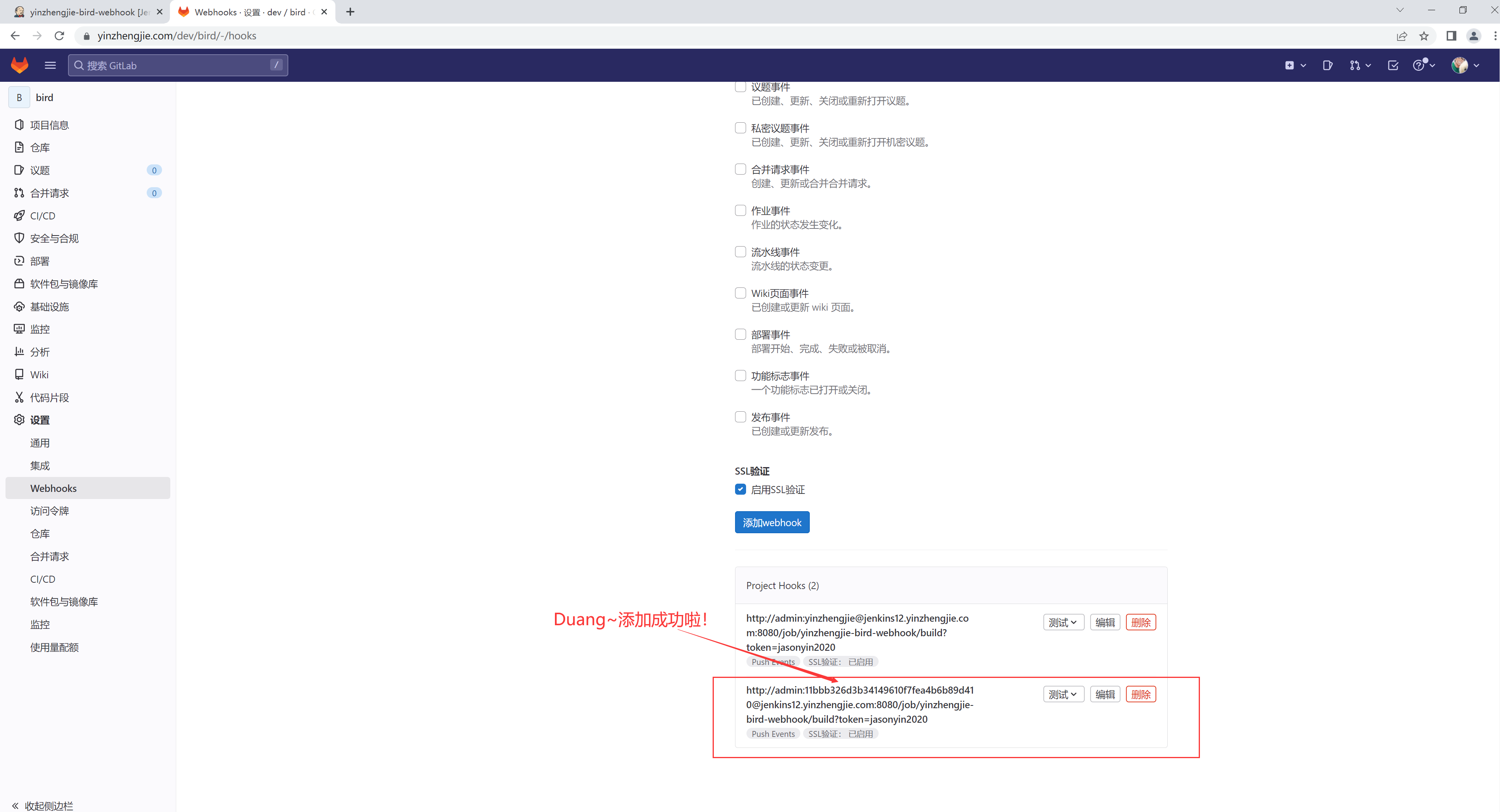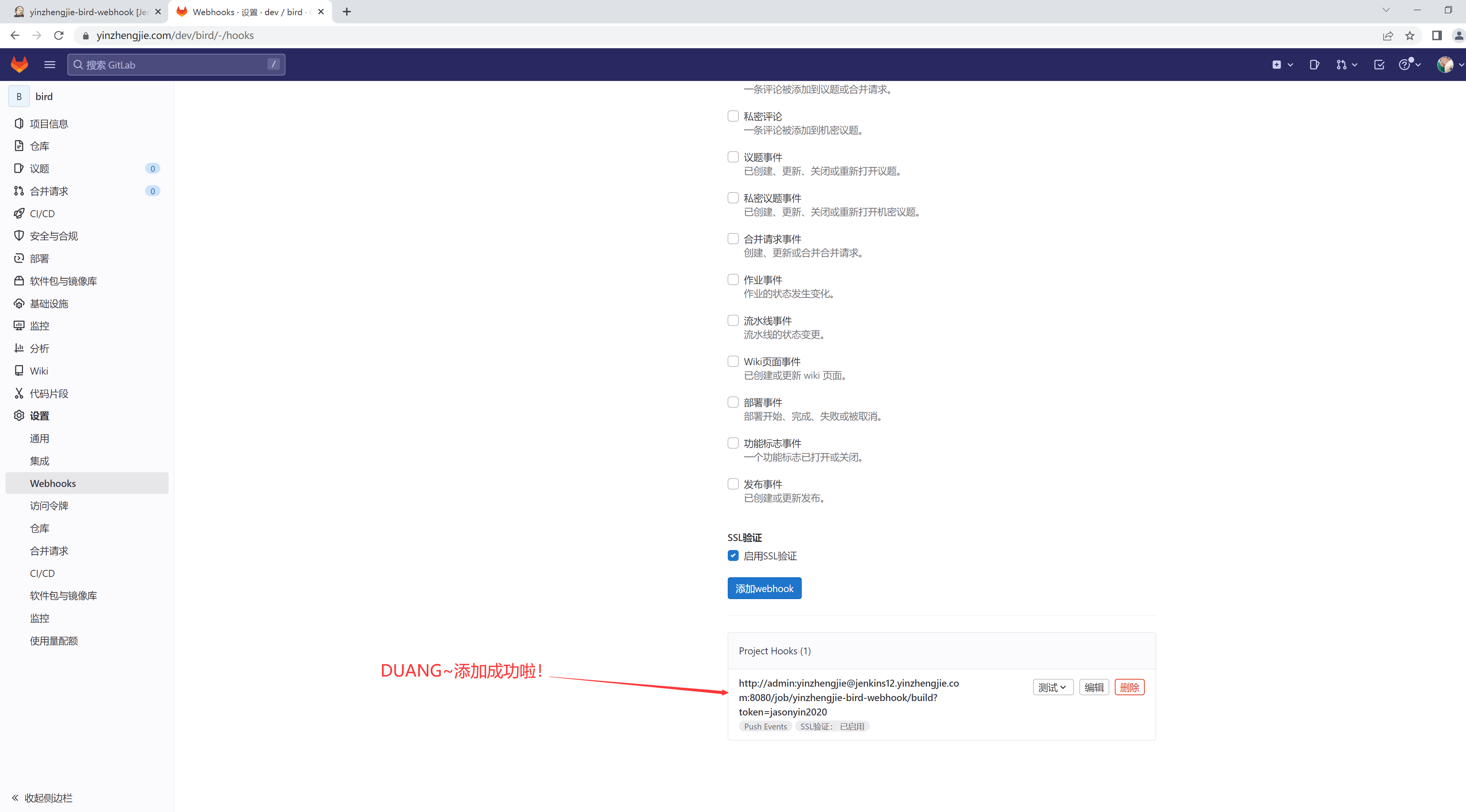 如上图所示,我们可以将Jenkins提供的配置直接复制到gitlab的webhook即可。