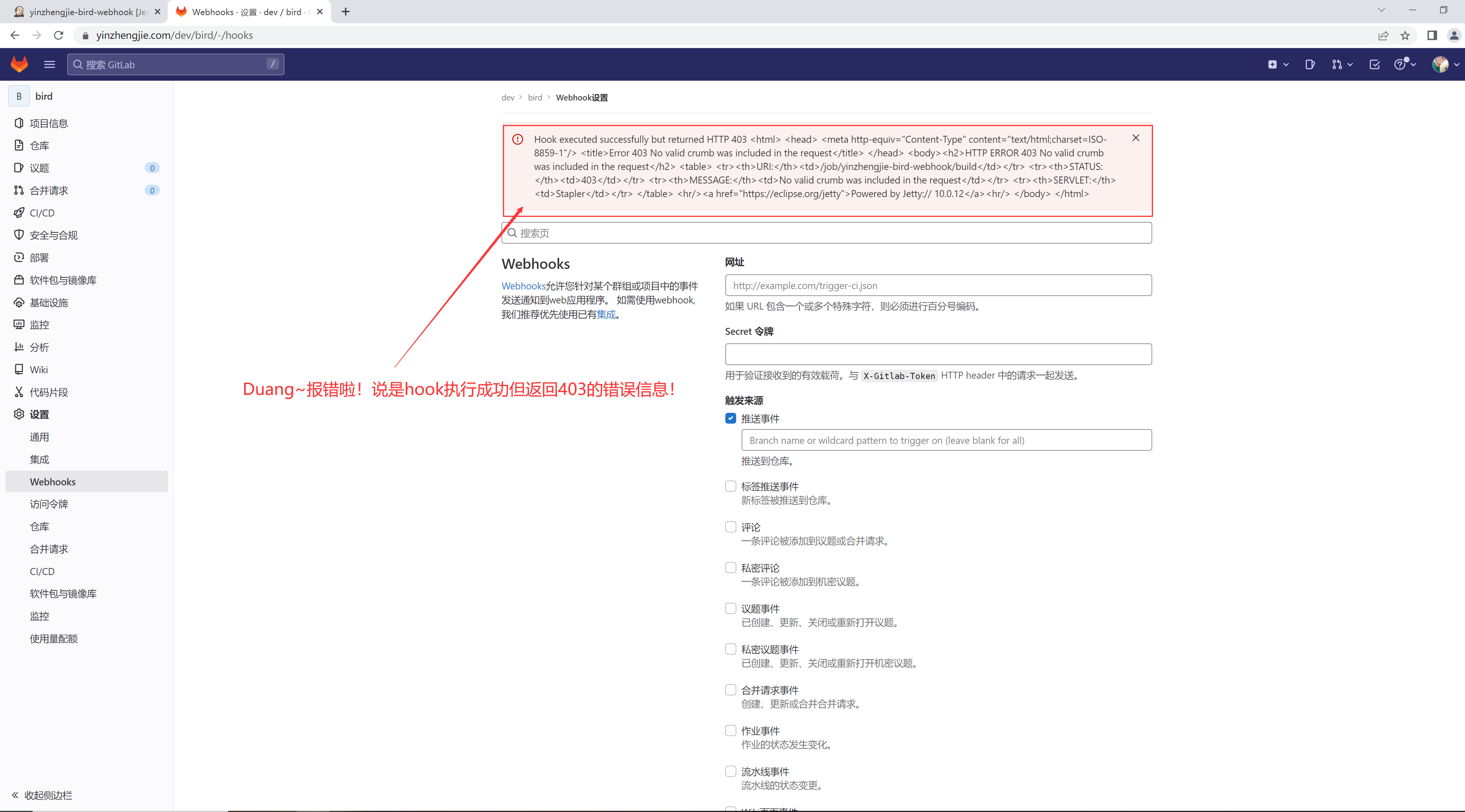 Hook executed successfully but returned HTTP 403 <html> <head> <meta http-equiv="Content-Type" content="text/html;charset=ISO-8859-1"/> <title>Error 403 No valid crumb was included in the request</title> </head> <body><h2>HTTP ERROR 403 No valid crumb was included in the request</h2> <table> <tr><th>URI:</th><td>/job/yinzhengjie-bird-webhook/build</td></tr> <tr><th>STATUS:</th><td>403</td></tr> <tr><th>MESSAGE:</th><td>No valid crumb was included in the request</td></tr> <tr><th>SERVLET:</th><td>Stapler</td></tr> </table> <hr/><a href="https://eclipse.org/jetty">Powered by Jetty:// 10.0.12</a><hr/> </body> </html>