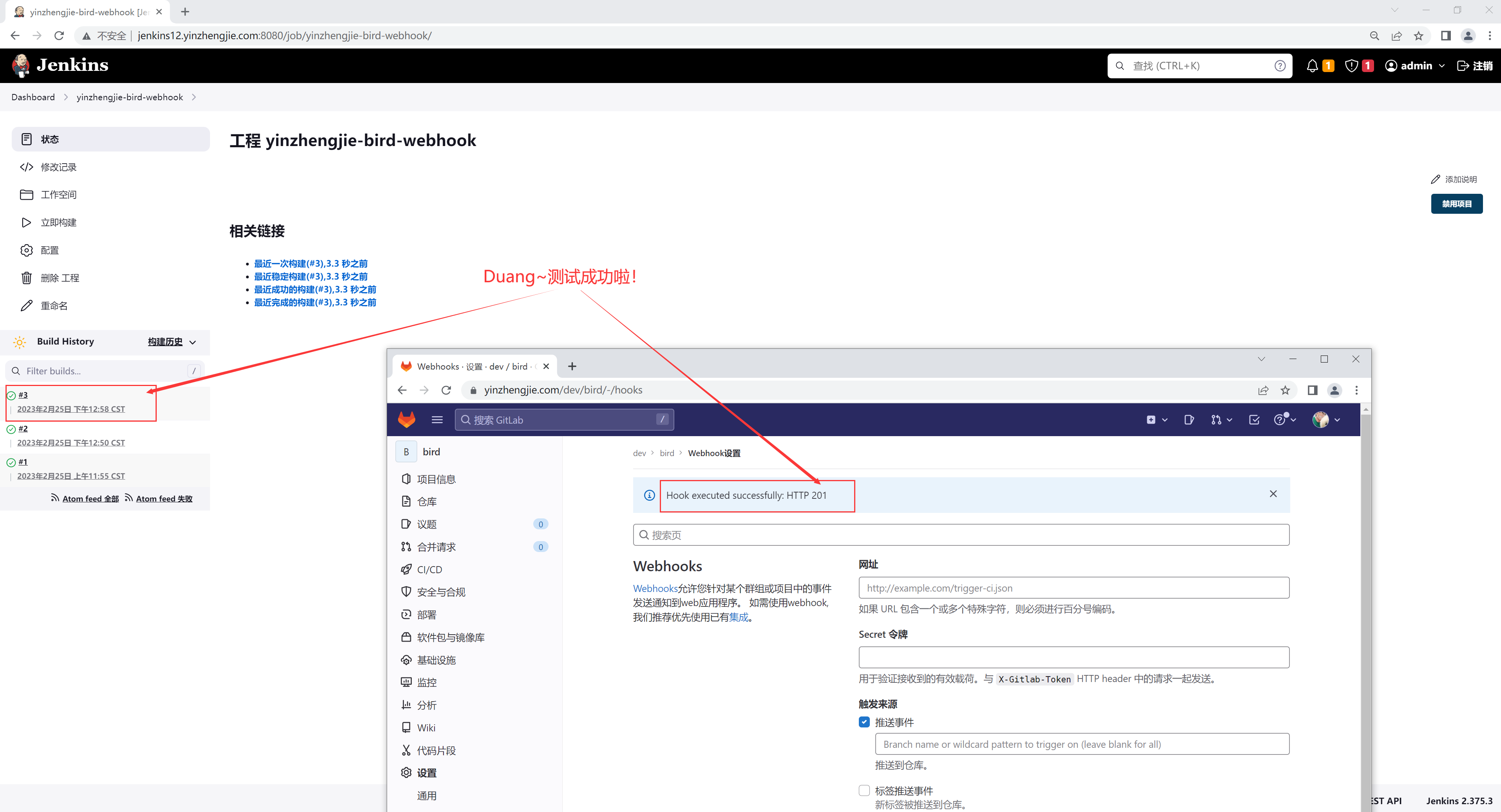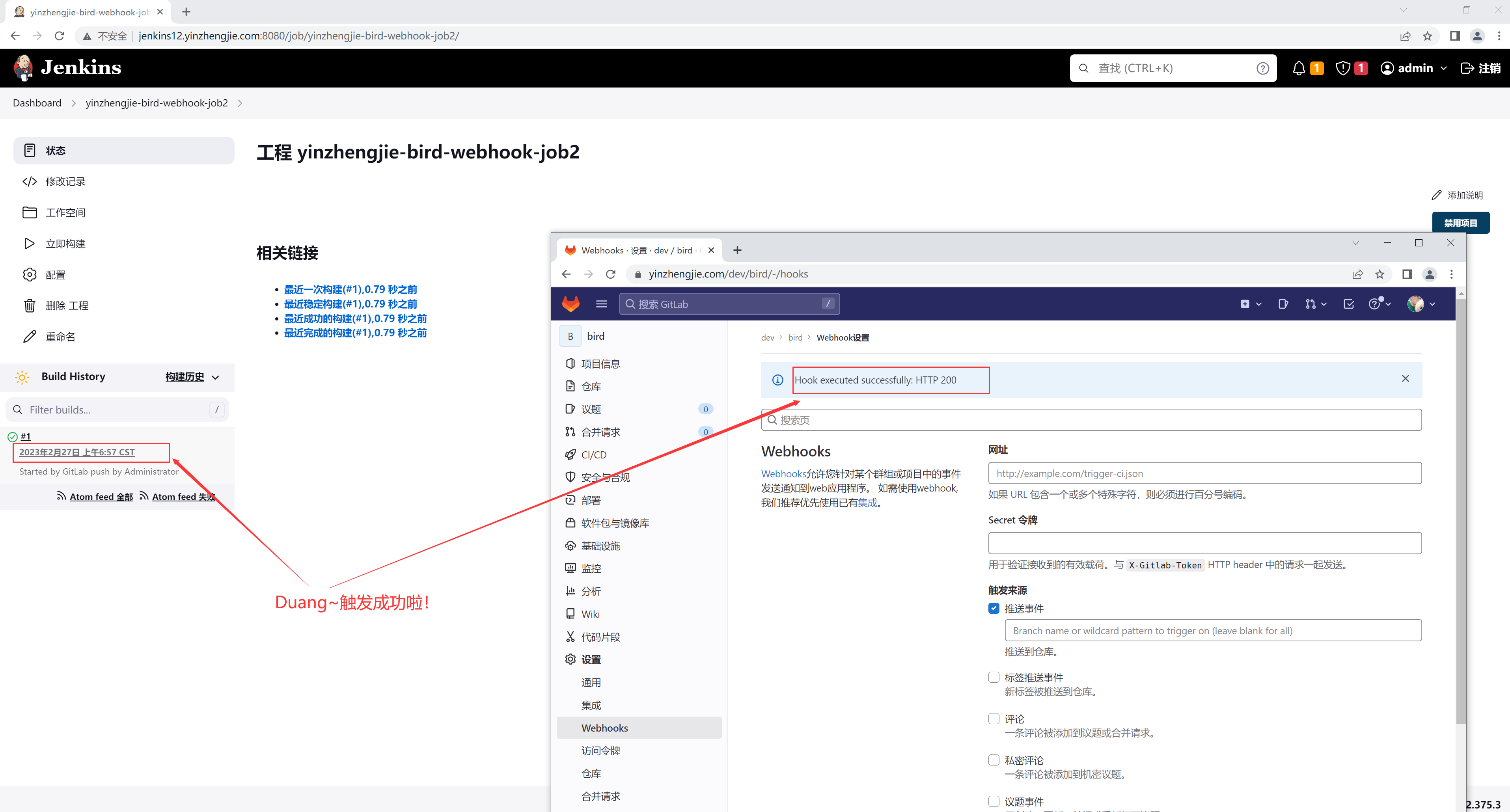 如上图所示,我们在gitlab手动发起webhook请求,不难发现触发成功啦。