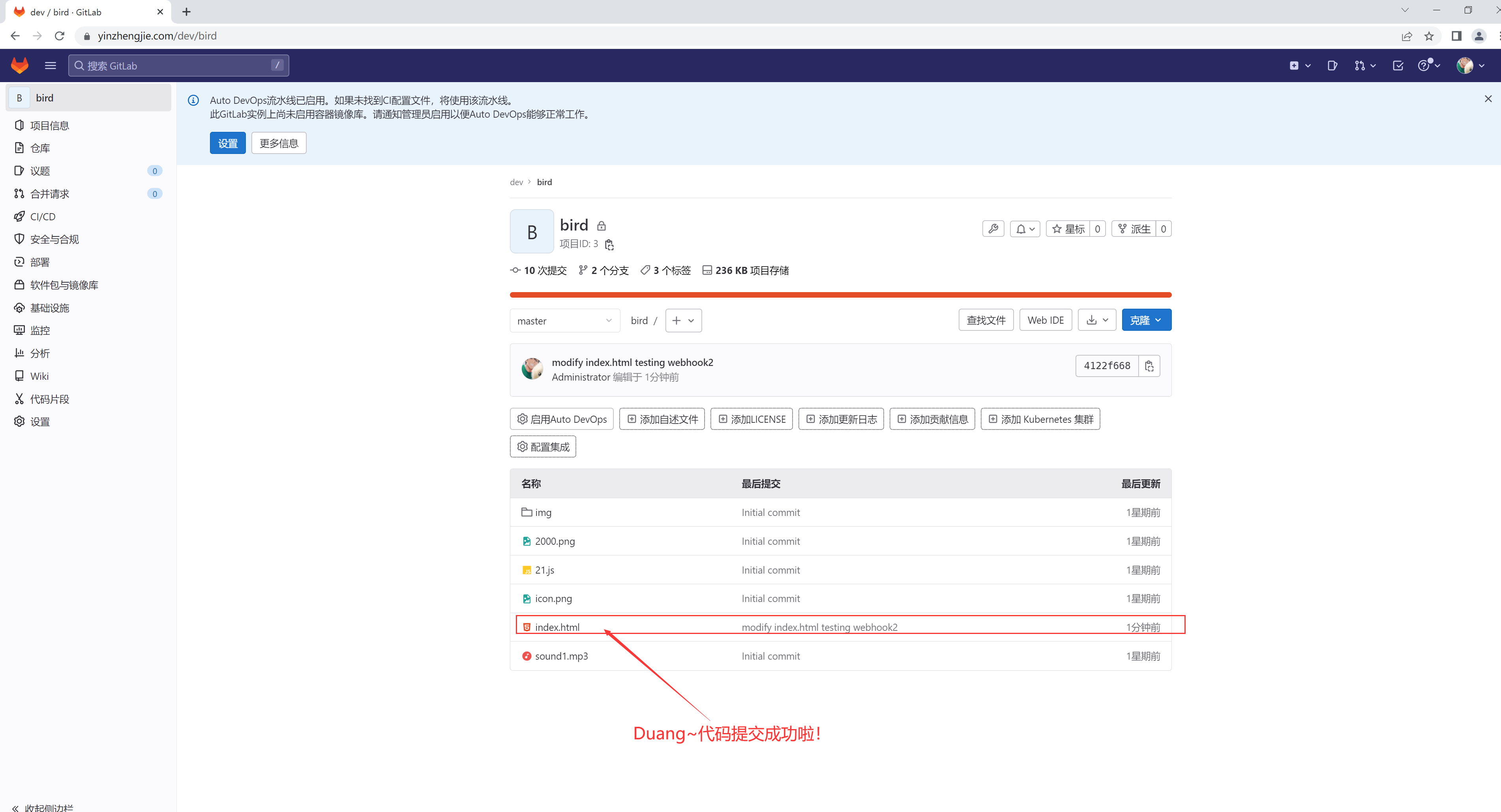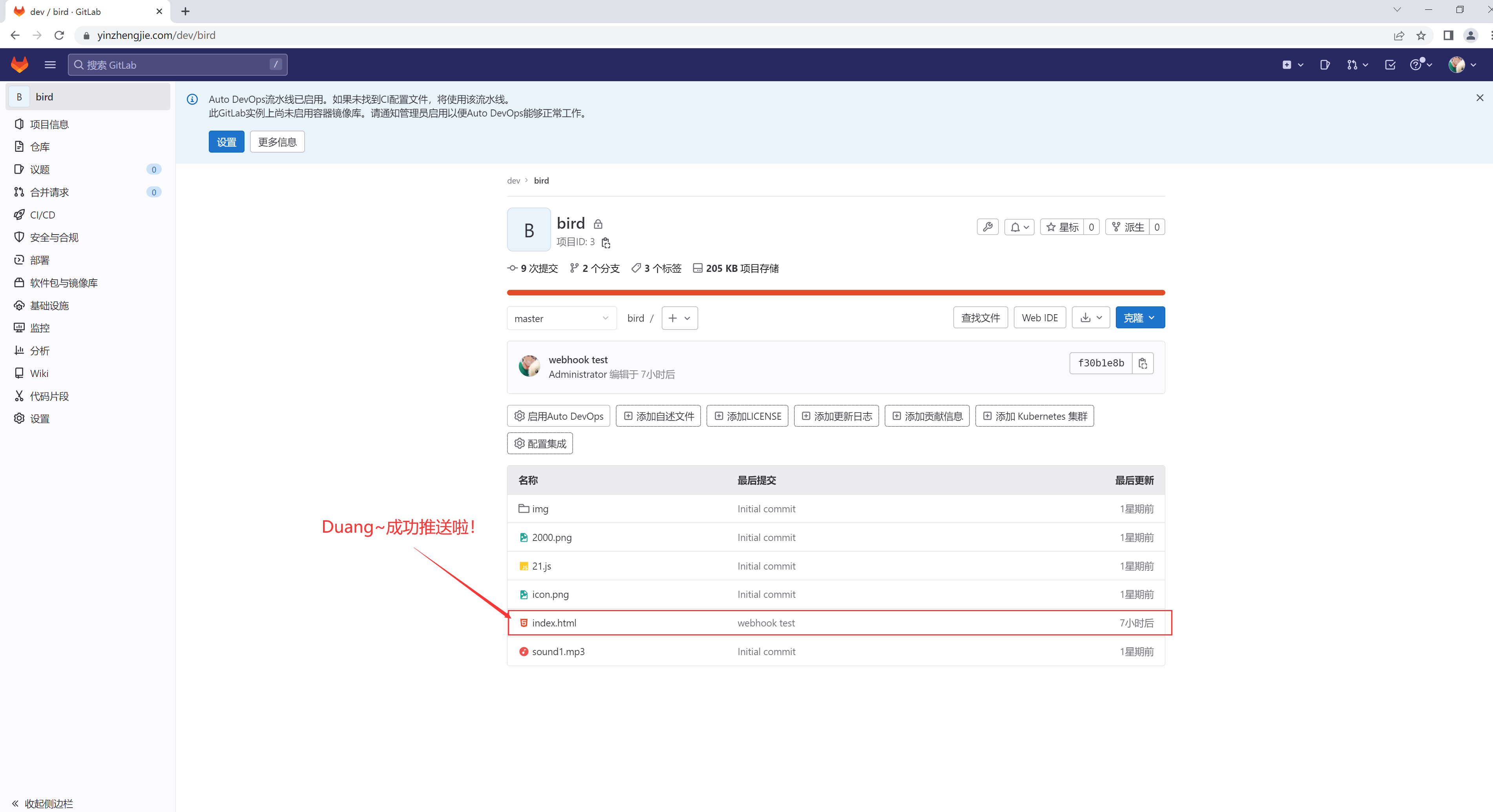 [root@centos10.yinzhengjie.com bird]# git commit -am 'webhook test'
