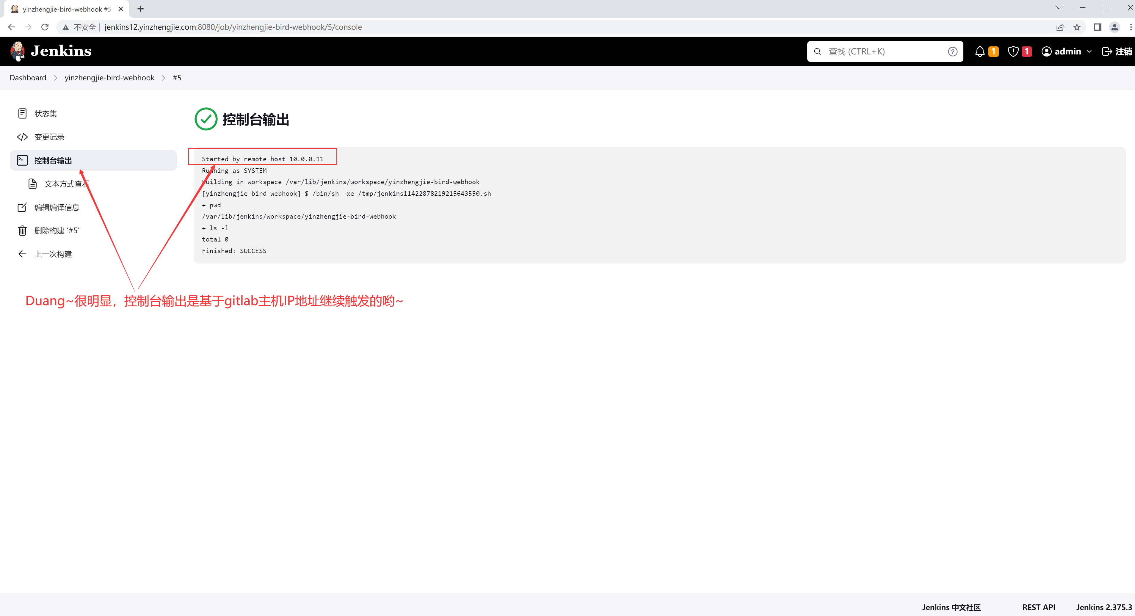 如下图所示,查看Jenkins的控制台输出不难发现本次触发是基于远程gitlab的IP地址触发的哟!