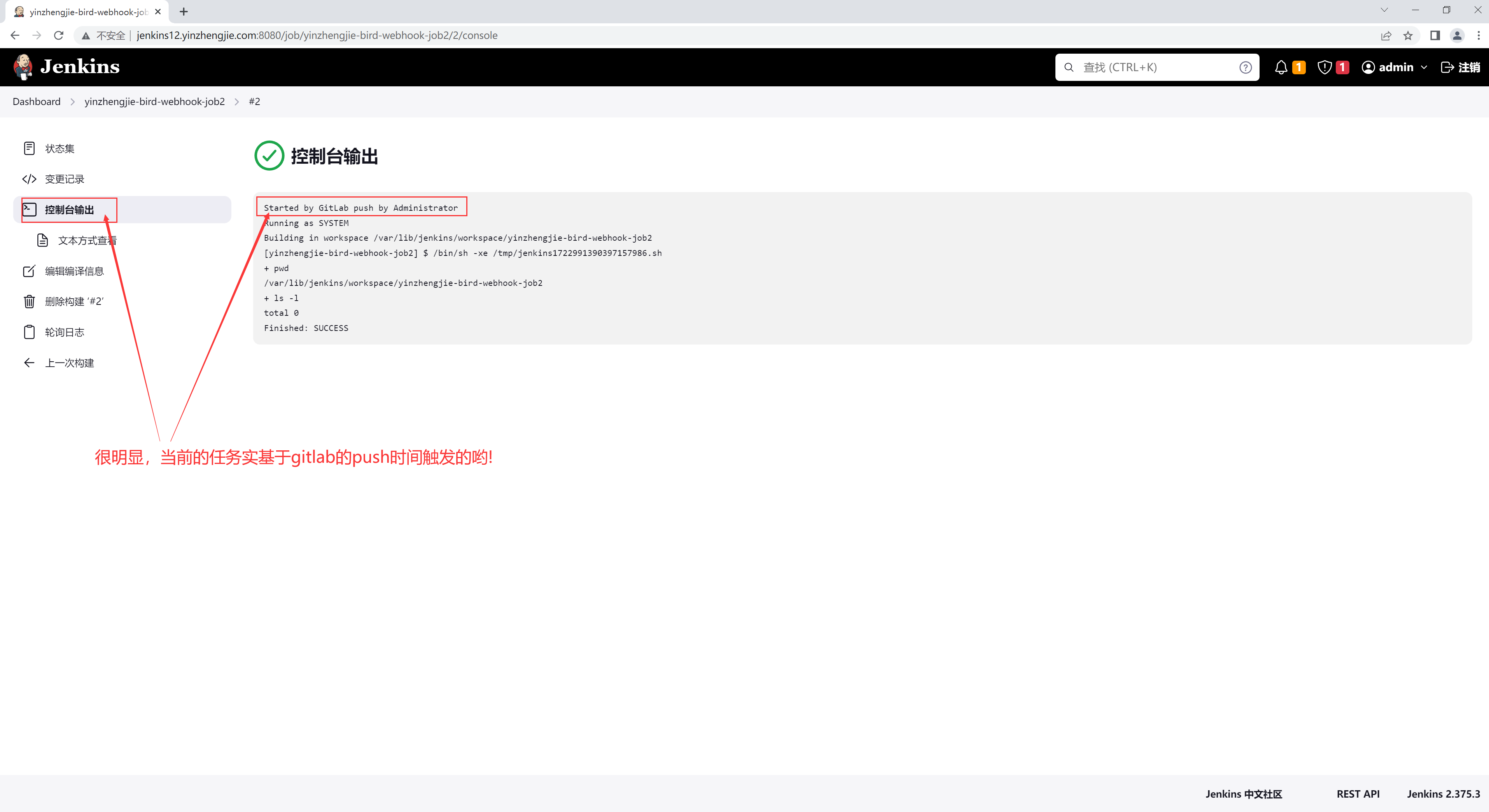 如下图所示,我们查看Jenkins的控制台输出,不难发现任务的确是被gitlab时间触发的哟!