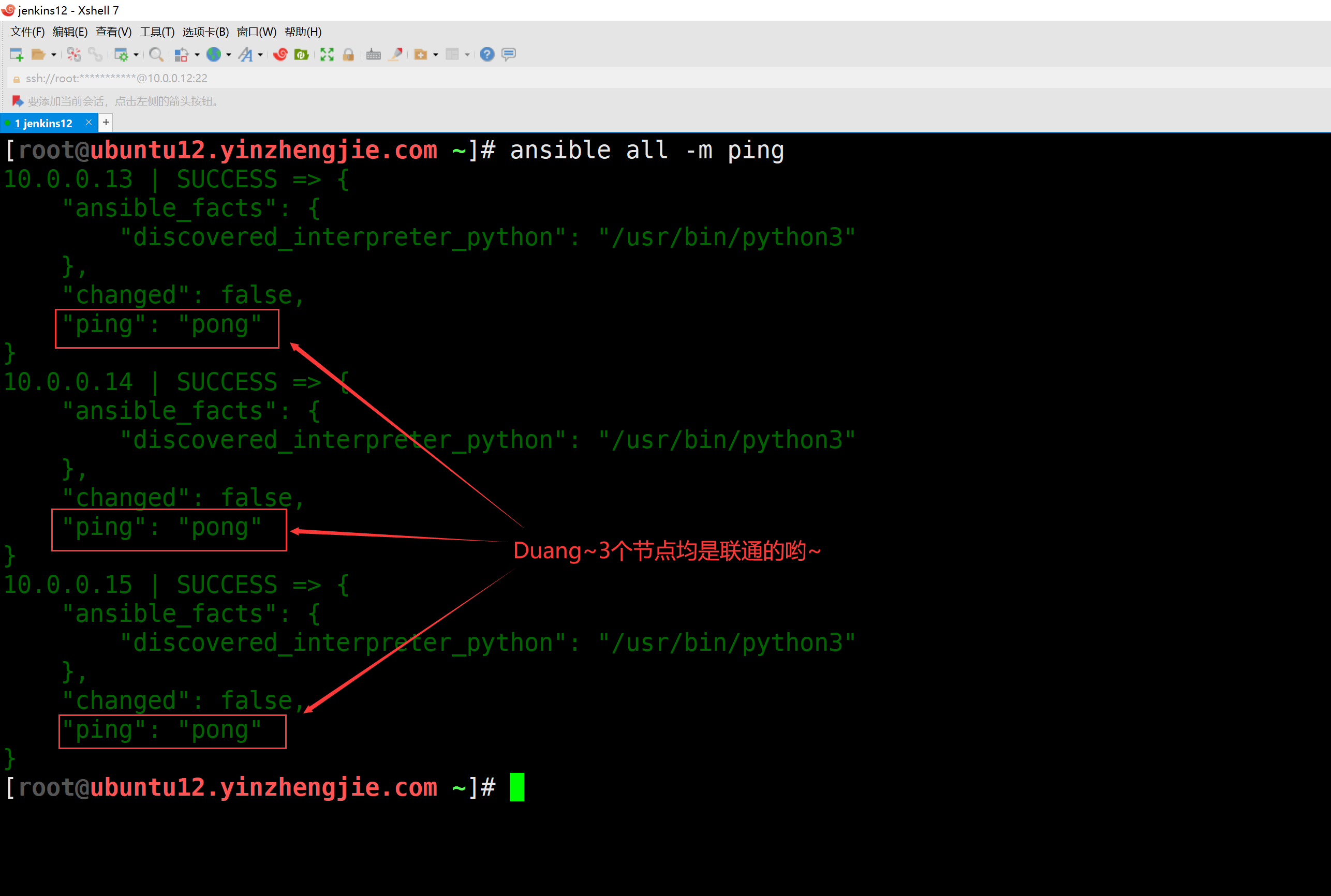 (4)验证ansible对后端主机的连通性,如下图