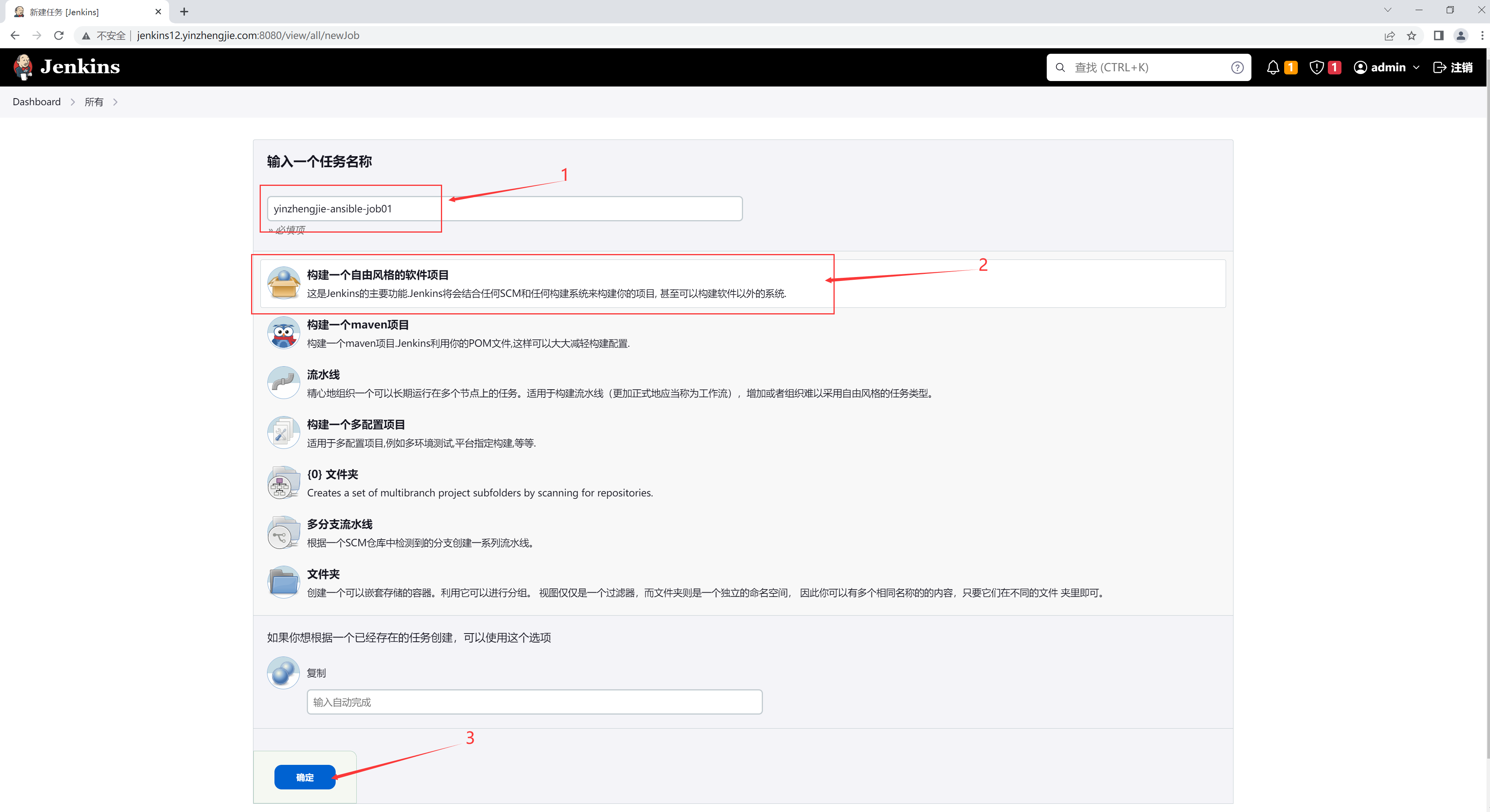 如上图所示,新建一个"yinzhengjie-ansible-job01"的自由风格项目。
