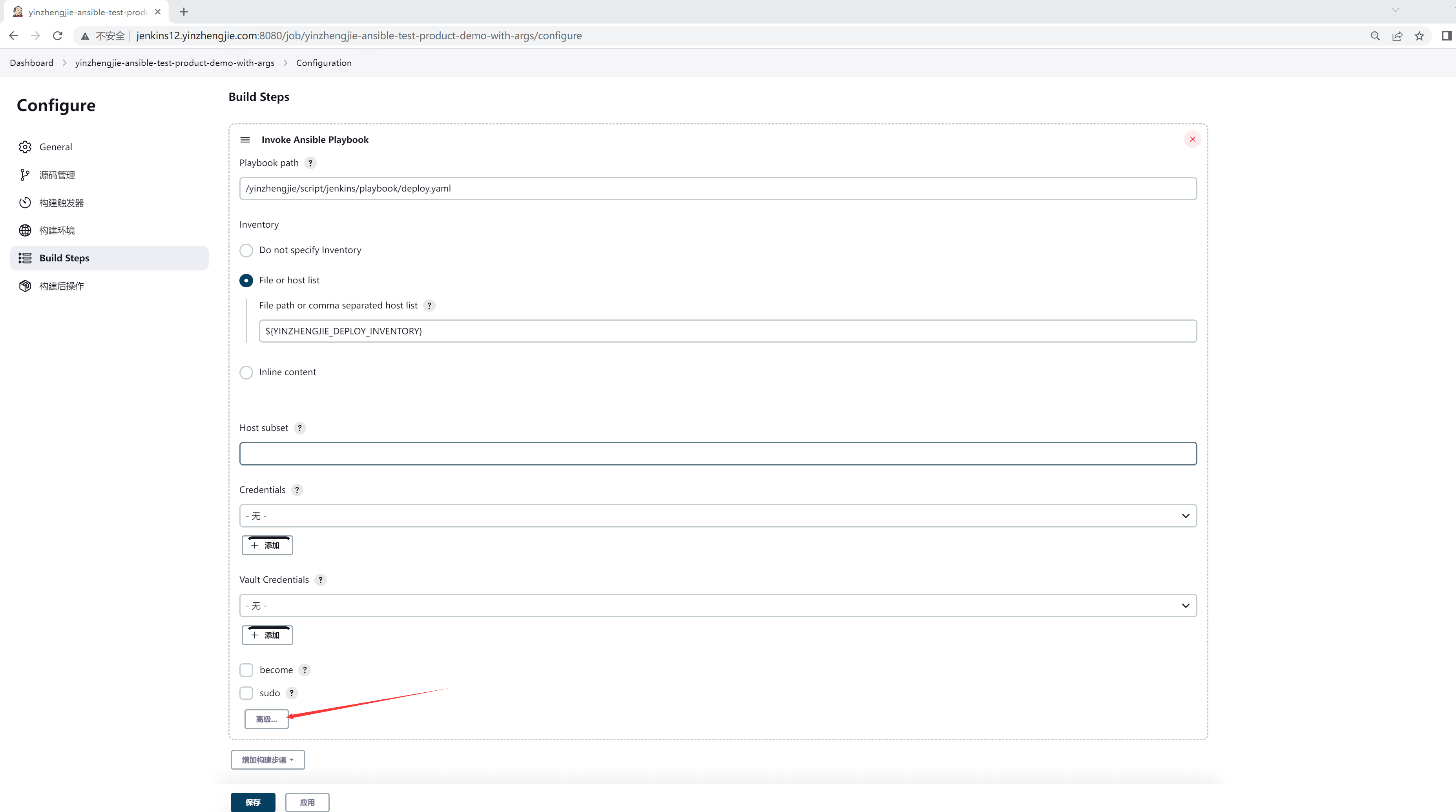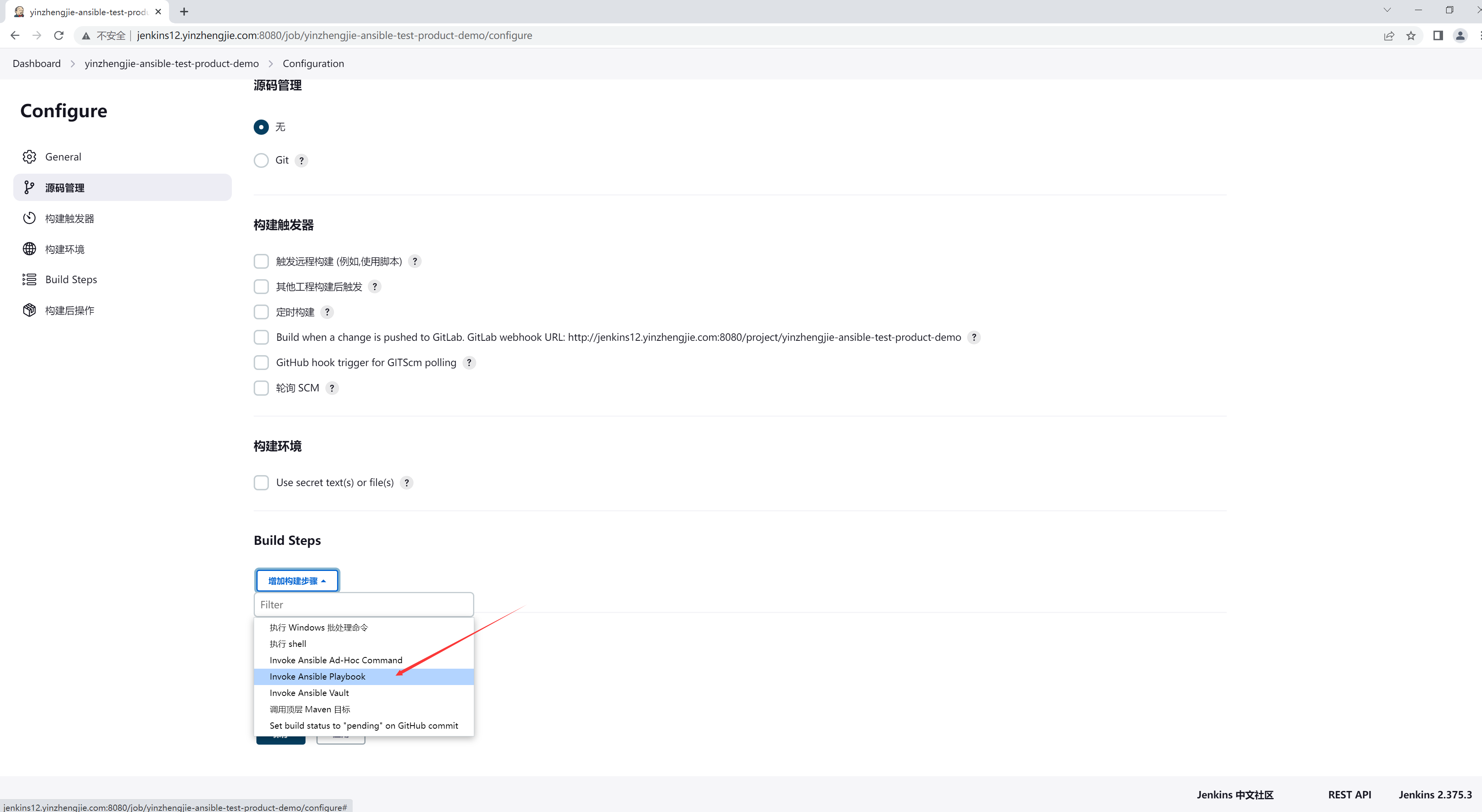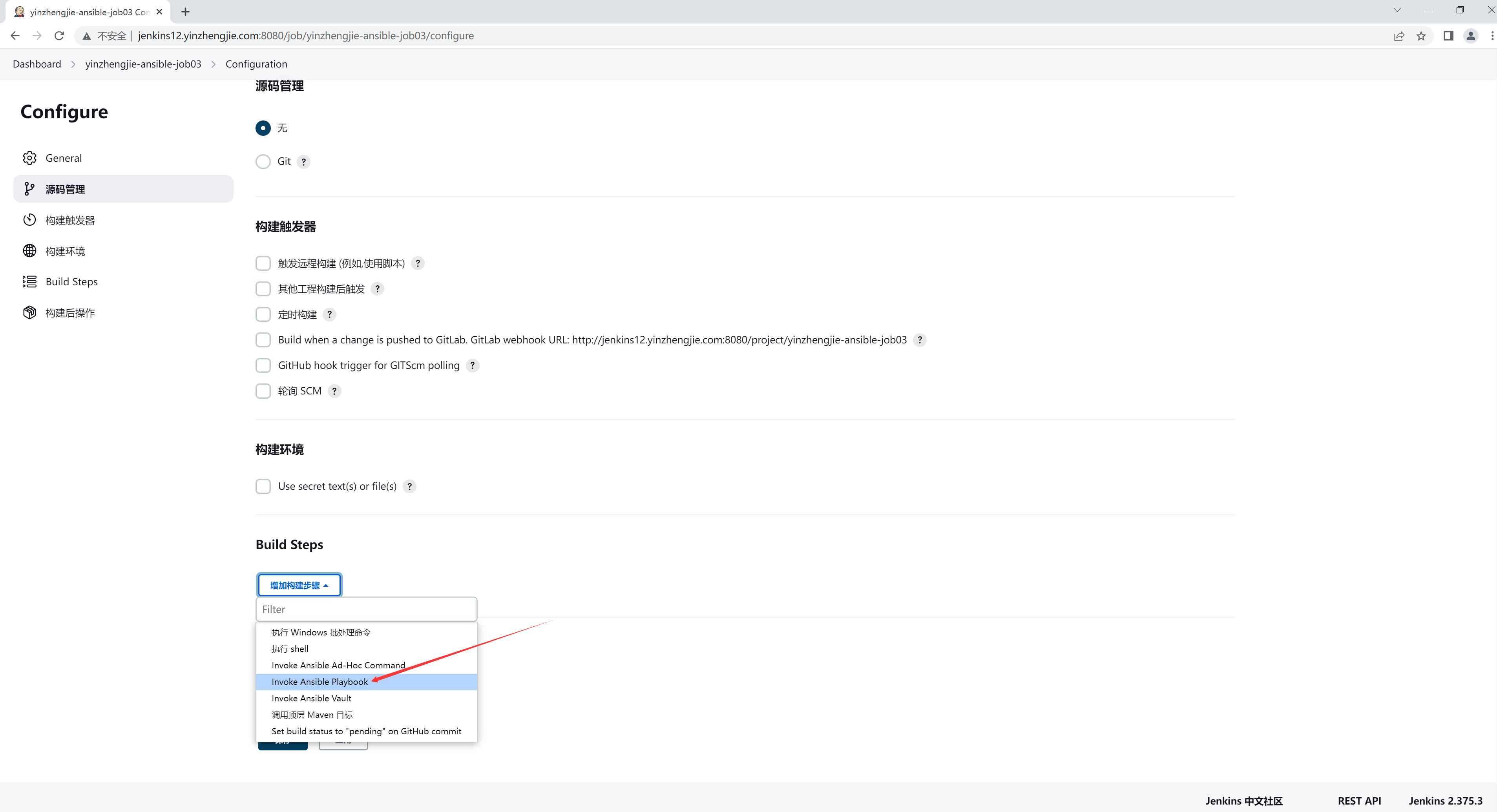 如上图所示,点击增加构建步骤,选择"Invoke Ansible Playbook"