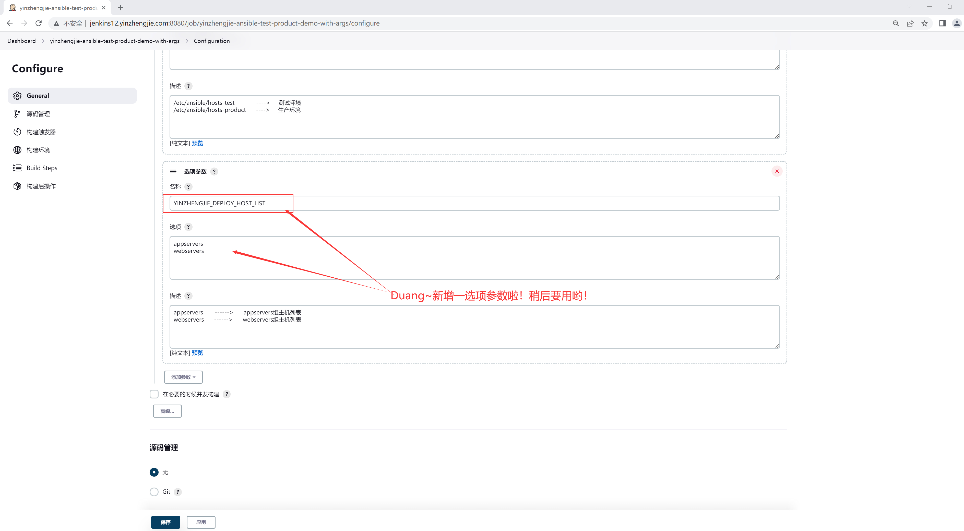 如上图所示,新增一个选项参数,并配置"YINZHENGJIE_DEPLOY_HOST_LIST"变量,如下图所示。