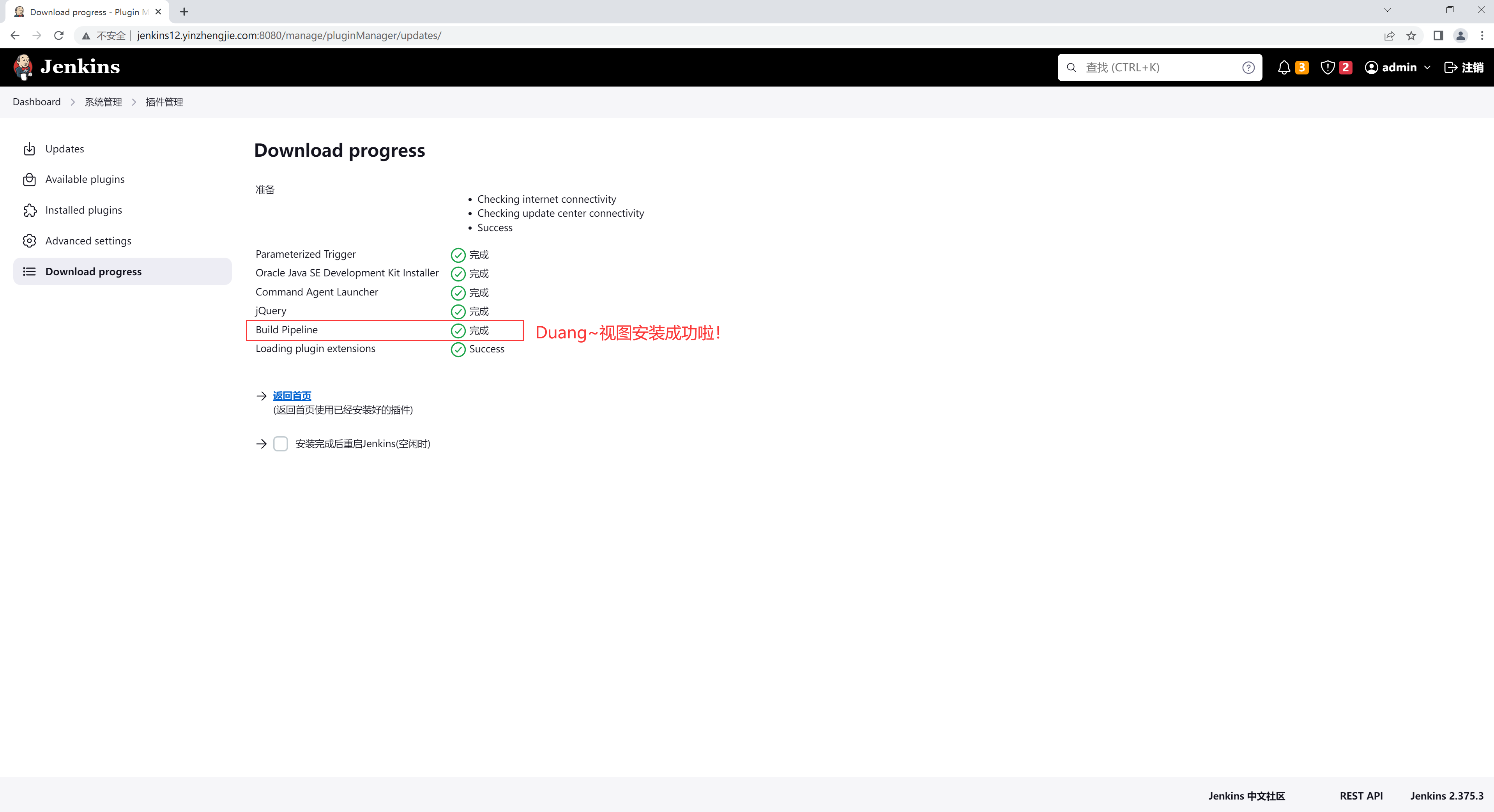 如上图所示,我们安装"build pipeline"插件,如下图所示,我们成功安装视图啦!