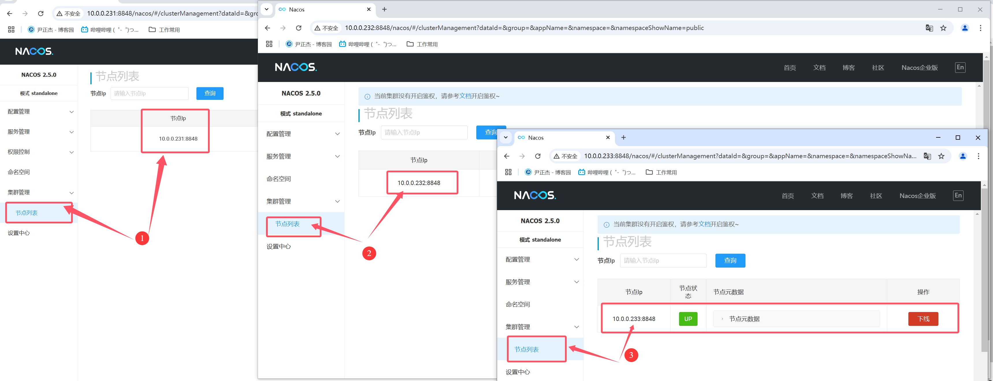 5.如上图所示,访问Nacos的WebUI,3个节点各自为政,目前并不属于同一个集群。