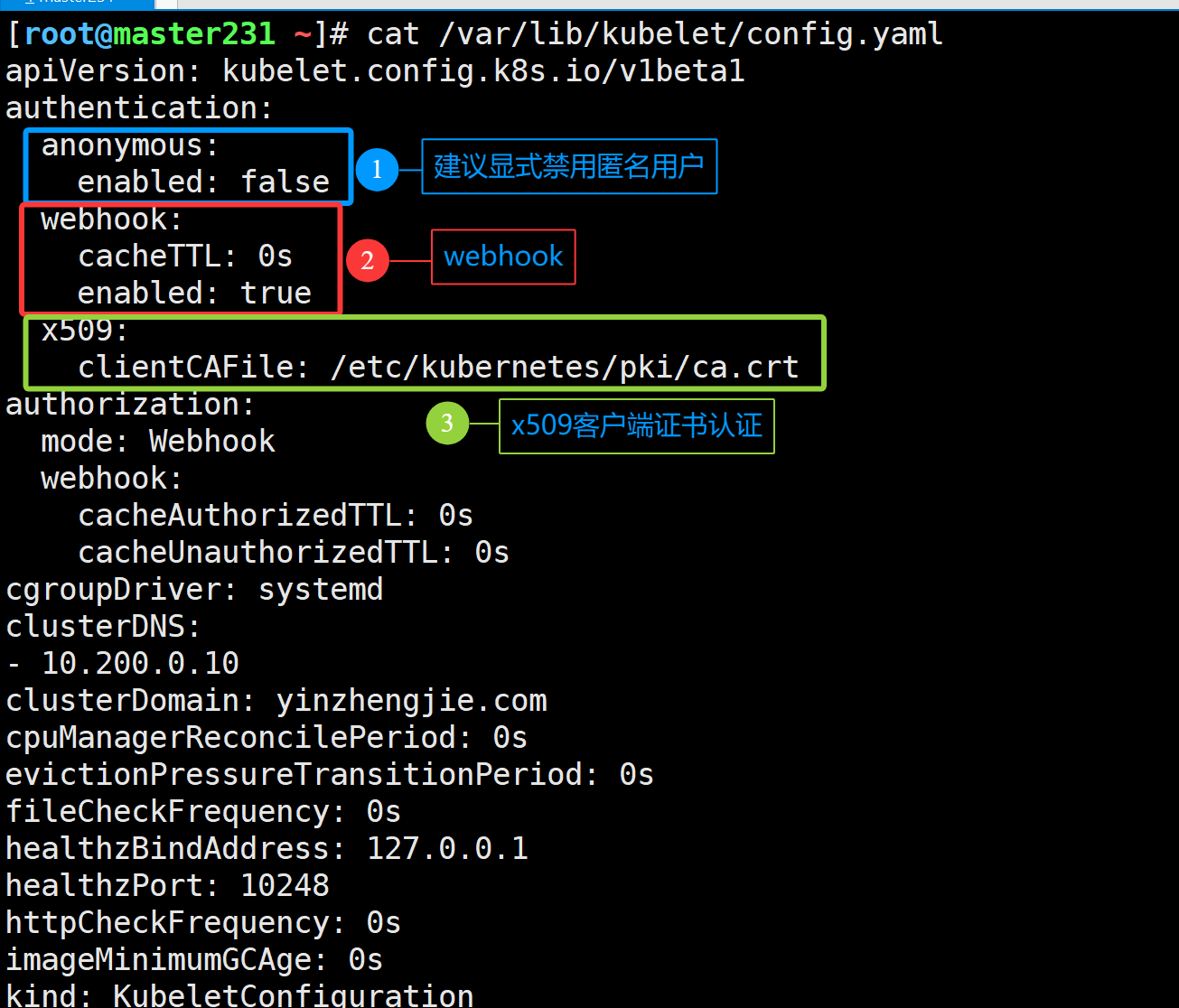 如上图所示,kubelet默认开启了客户端身份进行认证。