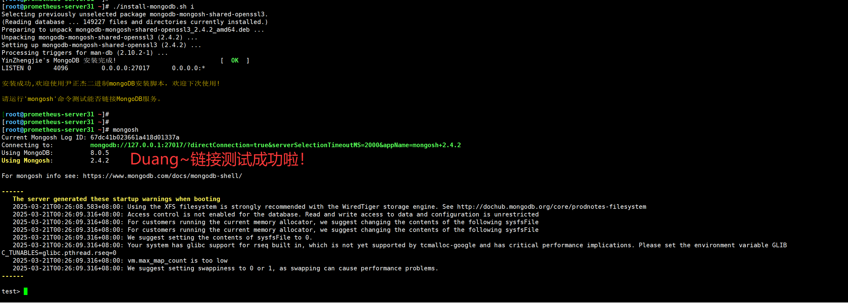 安装成功,欢迎使用尹正杰二进制mongoDB安装脚本,欢迎下次使用!