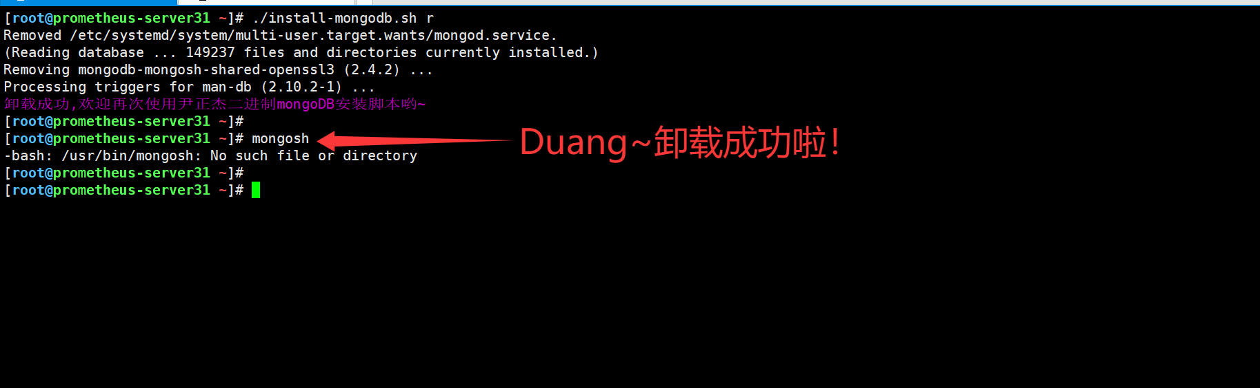 echo "卸载成功,欢迎再次使用尹正杰二进制mongoDB安装脚本哟~"