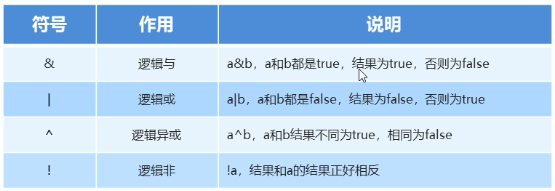 1 /* 2 逻辑运算符 3 */ 4 public class HelloWorld{ 5 public static void main(String[] args){ 6 //定义变量 7 int i = 10; 8 int j = 20; 9 int k = 30; 10 11 //”&“(逻辑与) 有false则false,无false则true 12 System.out.println((i > j) & (i > k)); //false & false 13 System.out.println((i < j) & (i > k)); //true & false 14 System.out.println((i > j) & (i < k)); //false & true 15 System.out.println((i < j) & (i < k)); //true & true 16 System.out.println("-------"); 17 18 //“|”(逻辑或) 有true则true,无true则false 19 System.out.println((i > j) | (i > k)); //false | false 20 System.out.println((i < j) | (i > k)); //true | false 21 System.out.println((i > j) | (i < k)); //false | true 22 System.out.println((i < j) | (i < k)); //true | true 23 System.out.println("-------"); 24 25 //“^”(逻辑异或) 相同为false,不相同为true 26 System.out.println((i > j) ^ (i > k)); //false ^ false 27 System.out.println((i < j) ^ (i > k)); //true ^ false 28 System.out.println((i > j) ^ (i < k)); //false ^ true 29 System.out.println((i < j) ^ (i < k)); //true ^ true 30 System.out.println("-------"); 31 32 //“!” (逻辑非) 奇数是true 偶数是false 33 System.out.println((i > j)); //false 34 System.out.println(!(i > j)); //!false 35 System.out.println(!!(i > j)); //!!false 36 System.out.println(!!!(i > j)); //!!!false 37 System.out.println("-------"); 38 } 39 }