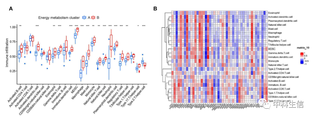 基于功能分析的结果,我们进一步探讨了两个簇之间免疫细胞浸润水平的相关性。HF 样本中近一半的免疫细胞水平 (12/23) 比健康对照组更丰富 ( P < 0.001),这表明 HF 患者已经显示出全身免疫激活的迹象,并且可能有助于进展为 HF。更重要的是,我们发现大多数免疫细胞(17/23)在两个簇中也有不同的浸润水平。此外,我们评估了48个能量代谢相关基因与 24个免疫细胞之间的相关性。大多数能量代谢相关基因的表达与免疫细胞的浸润有很强的相关性。