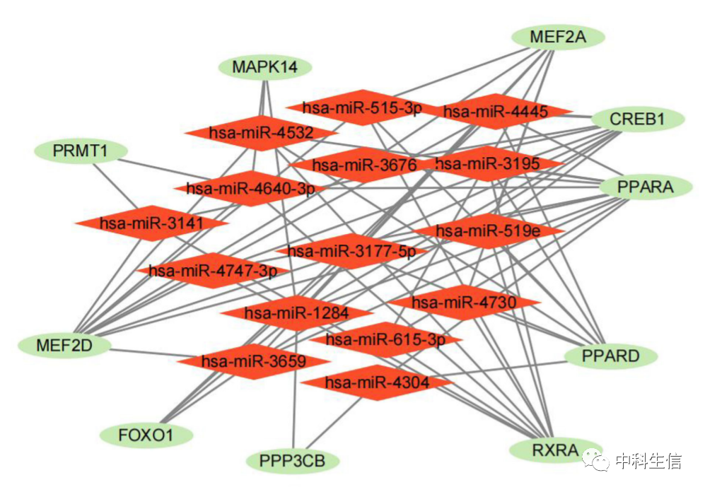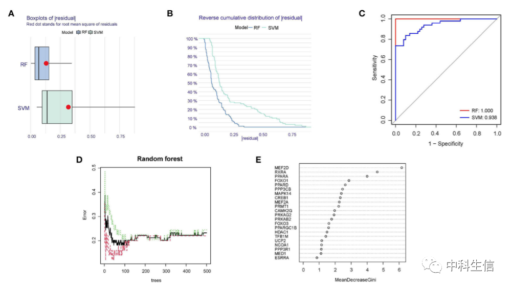 RF(AUC = 1.000)和 SVM 模型(AUC=0.938)的 AUC 表明 RF 模型具有更高的分离性能。为了进一步分析,将显著性> 2的10个基因确定为候选基因。在十个变量中,MEF2D、RXRA 和 PPARA 是最重要的,其次是 FOXO1、PPARD、PPP3CB、MAPK14、CREB1、MEF2A、PRMT1。