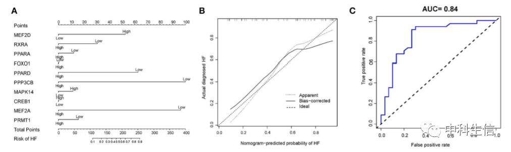 3.构建并验证了能量代谢相关的基因诊断列线图来预测 HF 的风险。