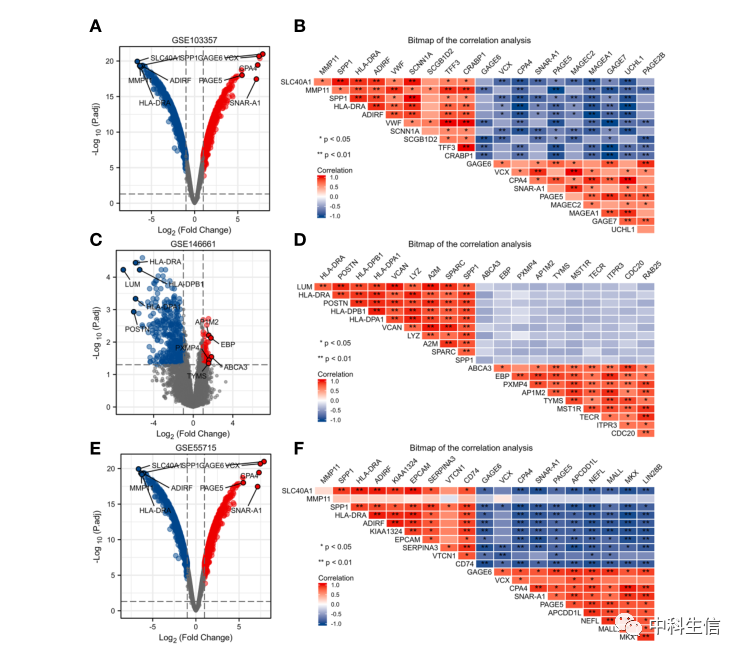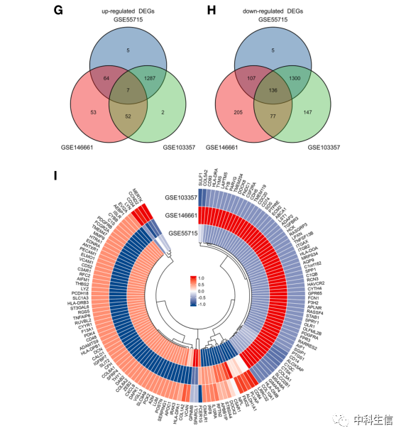GSE103357、GSE146661和GSE55715中DEGs的鉴定(图1)。(A)显示GSE103357中所有表达基因的火山图。(B) GSE103357中前10个上调或下调的DEG的相关性分析热图。(C)显示GSE146661中所有表达基因的火山图。(D) GSE146661中前10个上调或下调的DEG之间的相关性分析热图。(E)显示GSE55715中所有表达基因的火山图。(F) GSE55715中前10个上调或下调的DEG的相关性分析热图。(G, H)上调和下调的DEG的维恩图。(I) 143个重叠DEG的环形热图。