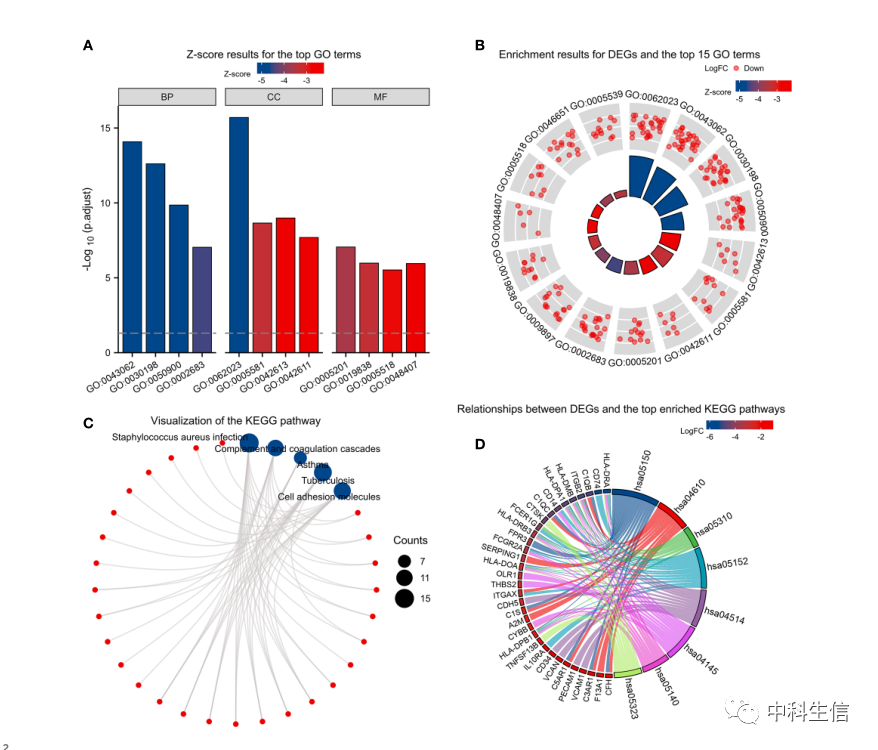 DEGs的KEGG和GO富集分析(图2)。(A)前12个GO术语的z得分结果,包括前4个bp、cc和mf。(B) DEGs和前15个GO富集结果。(C, D) KEGG富集分析。