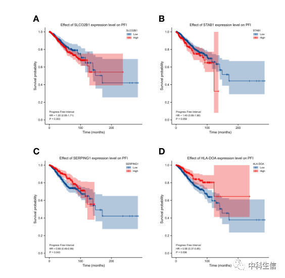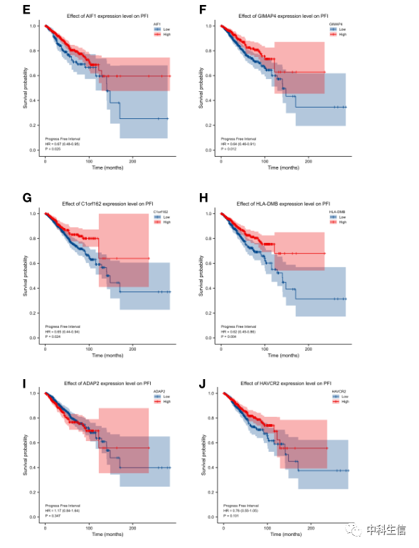 10个hub基因的无进展间隔(PFI)曲线。BC患者各基因高、低表达的无进展间隔(PFI)曲线(图5)。